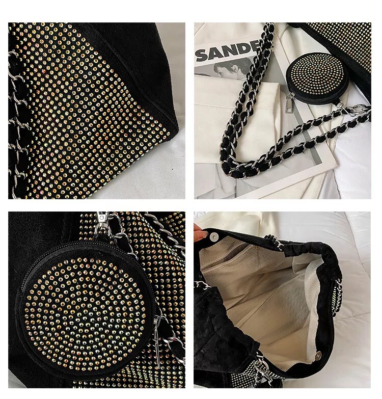 This tote bag is amazing for shopping and daily use! The material feels super high-quality, with a strong lining and soft velvet touch. I love the double chain and unique strap design—it adds a stylish flair. The small zipped pocket is perfect for keeping keys or coins safe. Got mine in gold, and it looks even better in person! Definitely recommend choosing your favorite color (gold, silver, or black) when ordering. Such a great buy!