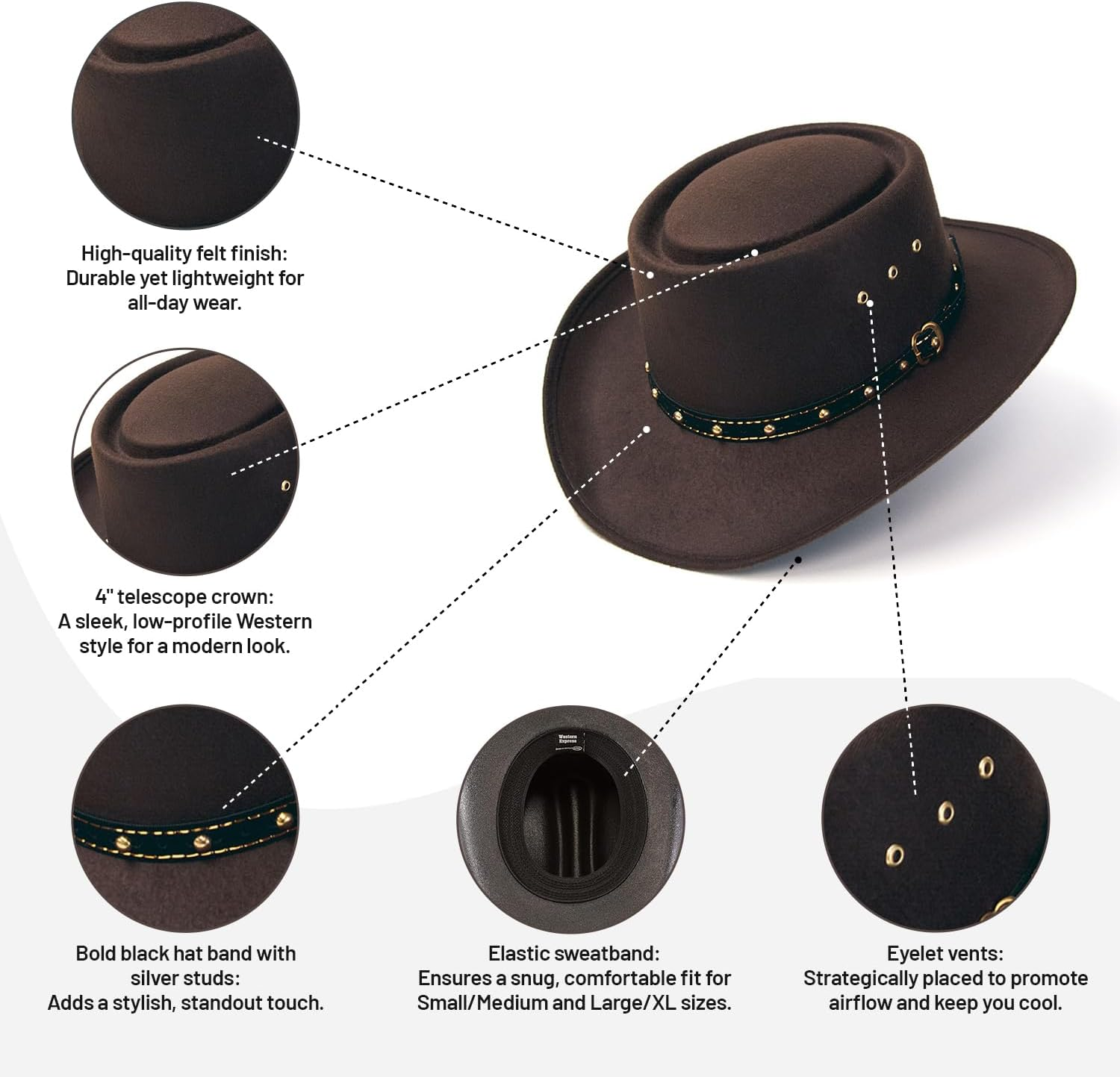 Store New Arrivals Add to Favorite View Feedback Contact Felt Finish Western Gambler Hat - Telescope Crown with Silver Studded Hat Band | Cowboy Hats for Men and Women Description Department mens Color Brown Size Small-Medium Product Description This timeless Gambler-style hat, featuring a premium felt finish and a Gold-studded black hatband, is designed for those who value classic Western sophistication. Perfect for ranch work, festivals, rodeos, or everyday cowboy and cowgirl wear, it’s also an excellent choice for casual outings, outdoor events, or adding a touch of Western charm to country-themed and Halloween parties. Classic Design: Features a 4" telescope crown and a 3 1/2" low brim, embodying the quintessential gambler style. Stylish Hatband: The brown hatband is embellished with gold studs, enhancing its Western appeal. Retro Brim: The 3 1/2" low brim offers subtle elegance and effective sun protection, embodying the classic gambler style Enhanced Ventilation: Gold-tone eyelet vents are strategically placed to ensure breathability, keeping you cool during warm weather. Outdoor Activities: Offers sun protection with a 3 1/2" low brim and breathable vents, making it ideal for ranch work or casual outings in style and comfort. Country-Western Events: Perfect for rodeos, festivals, and themed parties, this Gambler-style hat adds authentic Western flair to your look and makes you stand out. Costume Accessory: Add authenticity to country-themed or Halloween costumes with a distinctive telescope crown and gold-studded brown hatband. Underside: Sweat-Resistant Comfort The underside features a sweat-resistant lining to keep you dry and comfortable all day, while the elastic fit-all band ensures a sleek design and secure fit for adults. Our Western Style Cattleman Straw Hat Durable straw hat with 4 1/4" crown, rolled brim, black hatband, and silver conchos. Available in sizes A53-A63, S/M (CA-4E-M), and L/XL (CA-4E-L). Our Brown Felt Finish Cattleman Hat Classic brown hat with 4 1/2" crown, retro brim, and gold-tone hatband. Available in sizes A53-A63, S/M (CA-4E-M), and L/XL (CA-4E-L). 1. What materials are used in this hat, and how durable is it? Made with 70% polyester and 30% cotton, the felt finish ensures durability and a structured feel, perfect for everyday use or Western-themed events. Is the hat suitable for both men and women? Yes! This Gambler-style hat suits both men and women, combining timeless Western charm with a sleek, modern design. How does the hat fit, and what sizes are available? Features an elastic fit-all band for comfort, fitting Small/Medium and Large/XL sizes. Perfect for a secure fit across various head sizes. Can this hat be worn for special occasions Absolutely! Ideal for rodeos, festivals, Halloween, and everyday outings, it’s a standout Western accessory. What makes this hat unique compared to other cowboy hats? The telescope crown, low retro brim, and gold-studded band make it a bold Western statement, while the chin strap-free design adds modern sophistication. ABOUT US We offer the best prices around on high quality products. Our E-store includes media such as books, movies, music and games while offering electronics, toys, sporting apparel, clothing, tools, general home, garden items and more. SHIPPING We are always working hard to ensure your package arrives as soon as possible. Please understand that some factors like weather, high postal traffic, and the performance of shipping companies are outside of our control. We offer free shipping to the lower 48 states and ship within 2 business days of payment, usually sooner. We do not accept P.O. Boxes. Please provide a physical address. For shipping outside of the continental USA, we only use eBay's Global Shipping Program.The item is shipped to KY and then sent to the rest of the world. International customers are responsible for all duties and taxes. Continue to check out in order to calculate costs for shipping the item to your country. Messages regarding eBay's Global Shipping Program MUST be directed at eBay EXCLUSIVELY. RETURNS We offer a 30-Day Return Policy on items which you are not completely satisfied with. You have the option for a full-refund or an exchange of the item. No returns are available on items shipped outside of the USA. PAYMENT We accept PayPal. CONTACT US This page content is yet to come Please ad us to your favorite seller and visit again later Thank You CUSTOMER SATISFACTION We try our very best to make sure every customer is completely satisfied. If there's a problem, message us! We're happy to help. WE ACCEPT Copyright © 2021 AutoDS. | All Rights Reserved