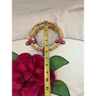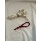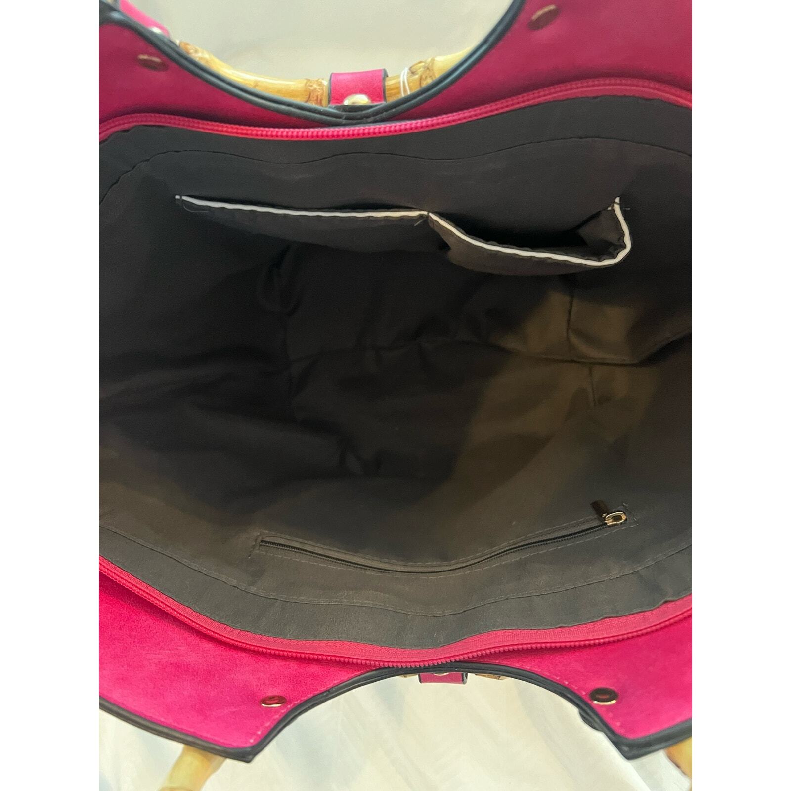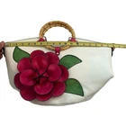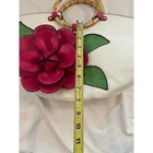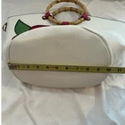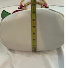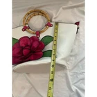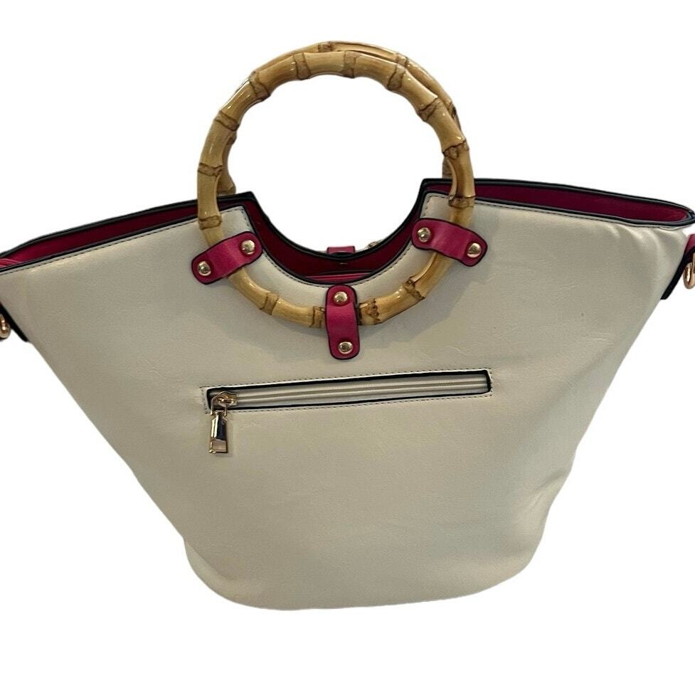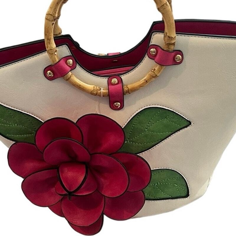 New without tags faux leather tote: White with green leaves and 3-D hot pink flower applique, also faux leather. Double bamboo round handles. Comes with shoulder strap and a small adjustable strap that can be attached to the zipper or shoulder strap for keys or another small attachable. Zip closure. Two interior patch pockets, one interior zip pocket, one exterior zip pocket. Measurements shown in photos. This is a new bag I purchased at a boutique in Newport, RI. It has not been used. Please zoom photo of bottom: It has a couple of very faint pinkish marks. Those were there when I bought it.