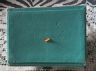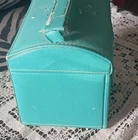 This turquoise jewelry box is perfect for organizing all your favorite accessories. With a faux leather exterior and velvet lining, this rectangular box features a convenient mirror and multiple drawers for optimal storage. The compact size, measuring 5" tall, 6" wide, 5.5" deep, makes it suitable for all types of jewelry, including necklaces, bracelets, rings, anklets, and earrings. Made in China, this jewelry organizer is a great addition to your collection. The lining is velvet, and the one drawer is compartmentalized. The material on the outside is starting to wear off, but if you are crafty, this can be redone with decoupage, material, or paint! Has a jeweled bow that snaps it closed. The handle makes it easy to carry.