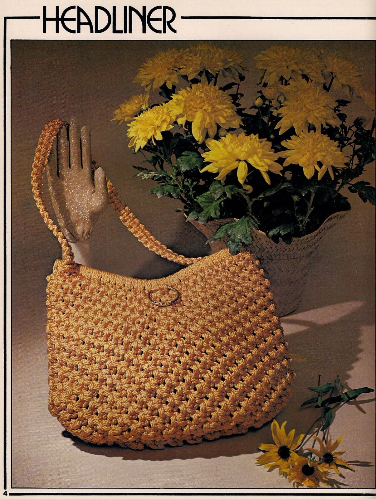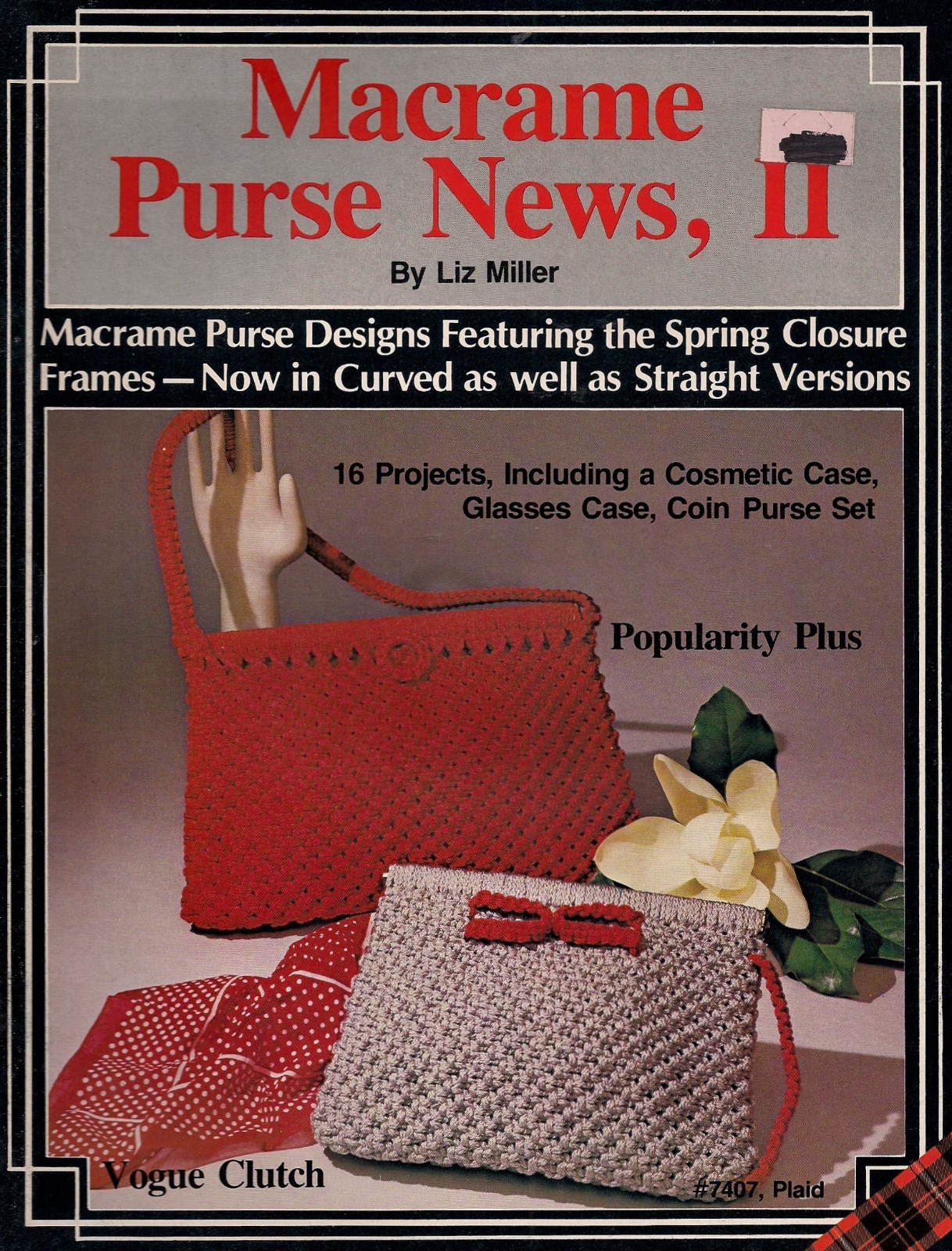 Macrame Purse News Vol. II by Liz Miller (# 7407, 1980 Plaid Enterprises, Inc.) 23 pages Description : Macrame purse designs featuring the spring closure frames - now in curved as well as straight versions. 16 projects including a cosmetic case, glasses case, coin purse set.