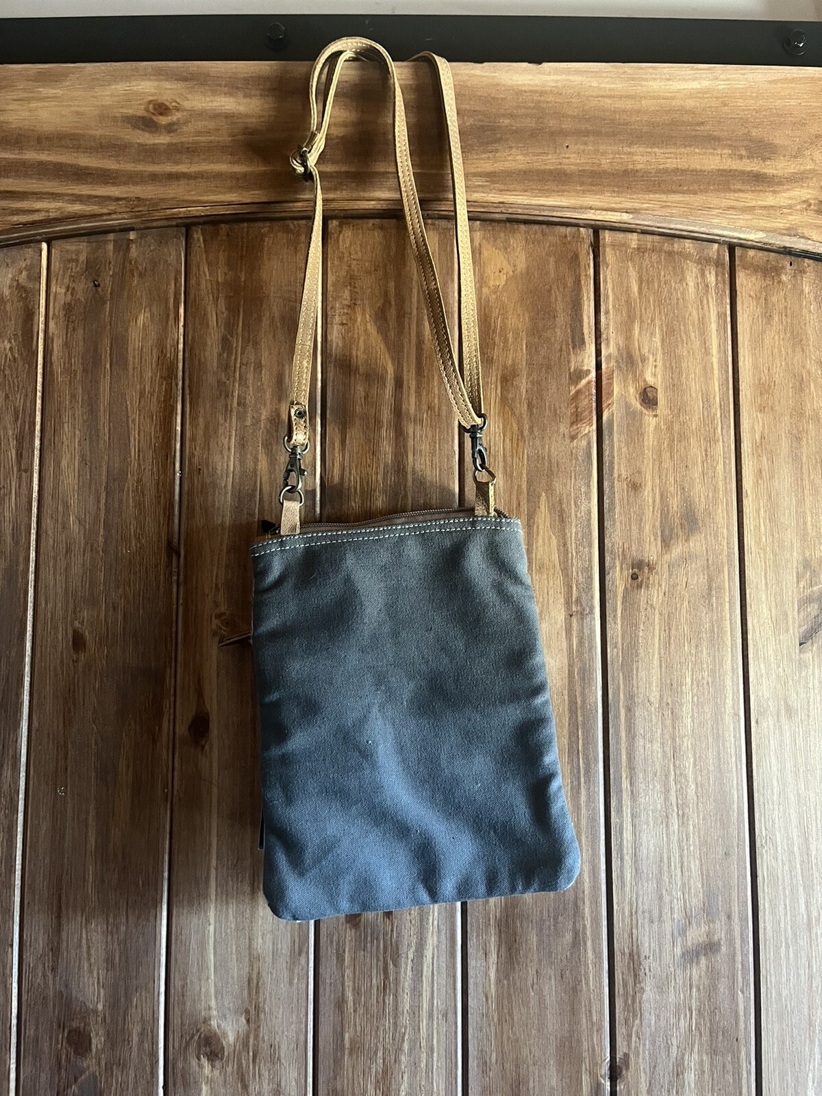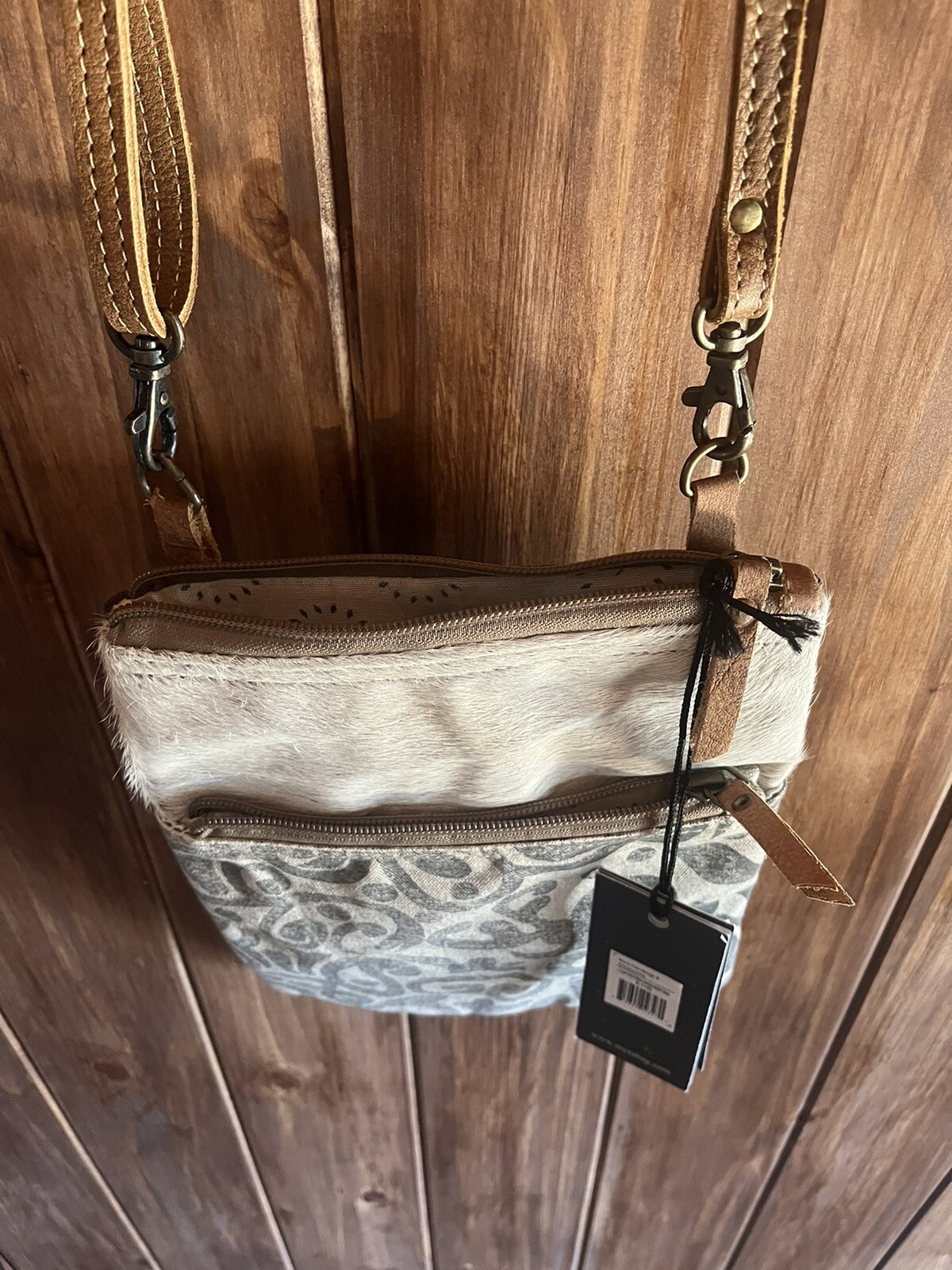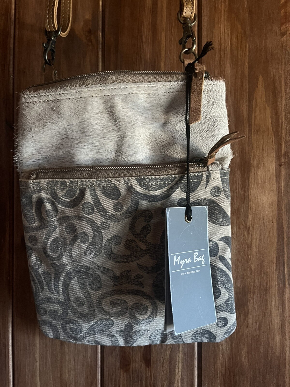 This Myra crossbody bag is the perfect accessory for any occasion. With a unique tribal rug and cow hair accents, it adds a fun touch to any outfit. The bag features a zip closure, two pockets, and a convertible wristlet, making it both stylish and functional. The adjustable strap allows for comfortable wear and the lightweight design makes it easy to carry. The bag is made with a blended fabric and cowhide leather exterior, and a cotton lining. It is small in size with a rectangular shape and measures 11.5 inches in width, 10 inches in height, and 2.5 inches in depth. The bag is part of the Myra Tribal Print & Hide product line and is perfect for travel, parties, casual outings, or business meetings.