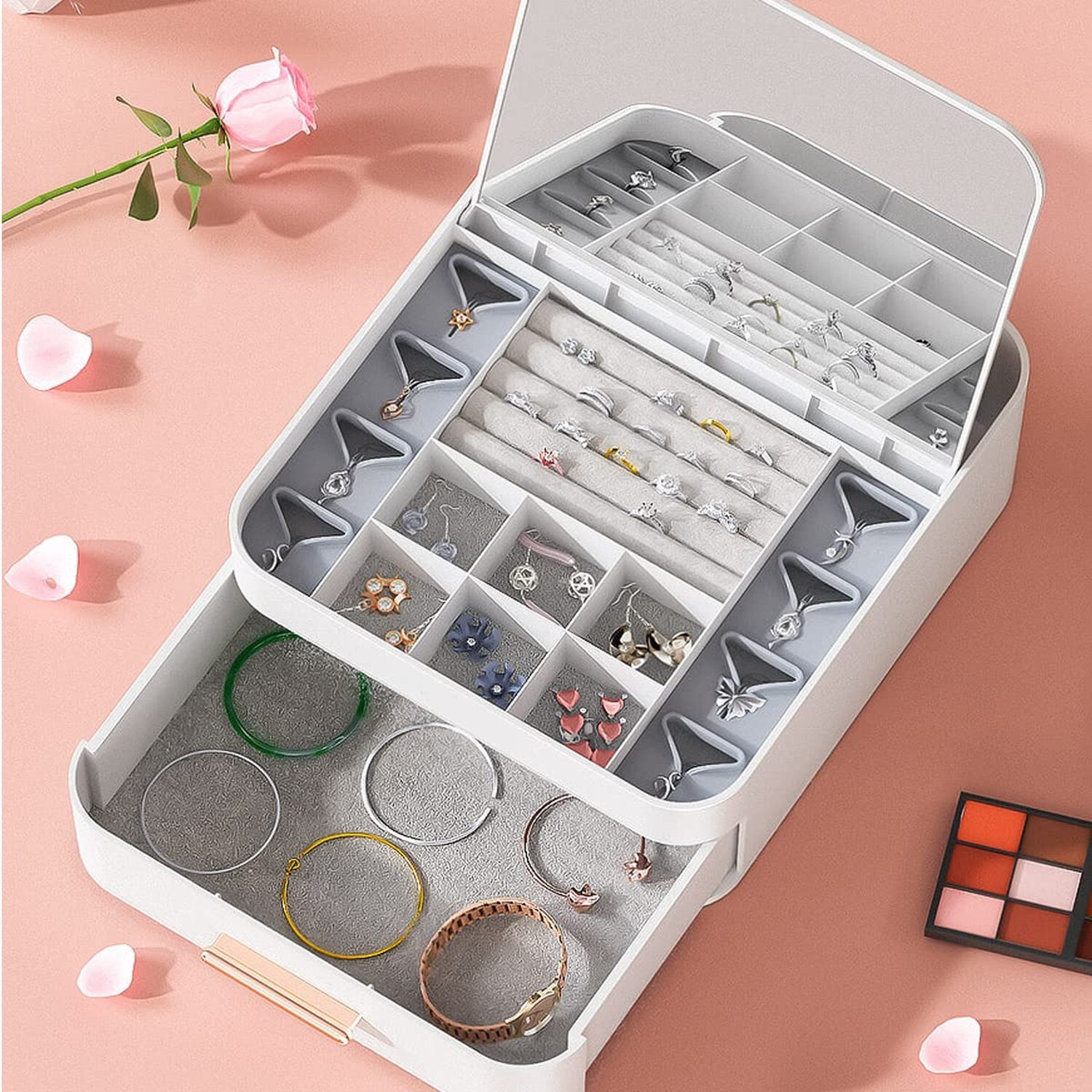 Jewelry Box Organizer for Girls Women,Travel Jewelry Case with Handle, 2 Drawers, Lockable Jewelry Organizer with Mirror, Lots of Storage Space,Modern Style Product Details Color: White Brand: iMotion Material: Plastic, Acrylic Style: Modern Special Feature: Waterproof Recommended Uses For Product: Face Makeup Product Dimensions: 9"D x 10"W x 1"H Target Audience: Women Occasion: Friendship Day, New Year, New Home, Thanksgiving, Valentine's Day Closure Type: Button Color: White Brand: iMotion Material: Plastic, Acrylic Style: Modern Special Feature: Waterproof Recommended Uses For Product: Face Makeup Product Dimensions: 9"D x 10"W x 1"H Target Audience: Women Occasion: Friendship Day, New Year, New Home, Thanksgiving, Valentine's Day Closure Type: Button Number of Drawers: 2 Item Weight: 16 ounces Number of Compartments: 4 Jewelry Storage Type: Jewelry Case UPC: 739240181377 Manufacturer: iMotion Item Weight: 1 pounds Country of Origin: China Special Features: Waterproof Batteries Included?: No Batteries Required?: No Date First Available: April 7, 2023 PortableDimension 9.1x 8.9 x 3.3 inches, Samll lightweight and easy to carry, put it in a Handbag or Suitcase when going out for Travel or Business, it will keep you in a happy and good mood during the journey. Functionit is a jewellery organizer for storage earrings, necklaces, rings, watches, lipsticks, earrings and other small jewelry accessories. BUILT-IN MIRROR: No more searching for a mirror when you want to change your earrings or fix your makeup. This small jewelry travel case has an adjustable mirror inside that gives you a clear and accurate reflection. Its like having a mini vanity in your pocket. How fabulous and convenient is that? Plus, the mirror helps you look and feel confident BEAUTIFUL GIFT BOX: Surprise her with this elegant and practical travel jewelry case. It comes in a lovely gift box that makes it ready to give. This is an amazing gift idea for any occasion - birthday, anniversary, Mothers Day, Valentines Day, or just because. Show her how much you care and make her feel special and appreciated.