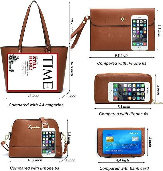 Material: This tote bag for women is made of high quality synthetic leather and polyester lining with durable gold hardware. Detailed stitching with smoothly zippers. Highly anti-scratch and tear-resistant, not easy to be out of shape. Eco-friendly and no animals were harmed. Pockets: Tote bag: One main compartment with one interior zipper pocket and two slot pockets. 5pcs purse set include large tote handbag, messenger bag, wallet, clutch and card holder. The purse set can hold your iPad, wallet, makeups, phone, little water bottle, perfumes, gloves and other daily use and keep them organized. Special Design: Top zipper closure. Detailed with high quality gold tone hardware, zippers, flat bottom studs with maple leaf decoration looks more fashion. Decorated with a top handle can be used as a women tote bag, daily purse, shoulder bag, top handle bag, work bag, laptop bag etc. Dimension: Tote Handbag: 13" x 10.3" x 5"(W*H*D), Strap Height:10.7" Messenger bag: 10.2" x 7" x 4"(W*H*D) Wallet: 7.8" x 4"(W*H) Clutch: 9.8" x 6.3"(W*H) Card Holder: 4.4" x 3"(W*H). You can use them together or individually, suitable for daily use. Functional: The purse set perfect for dating, shopping, working, traveling, party and other occasions.