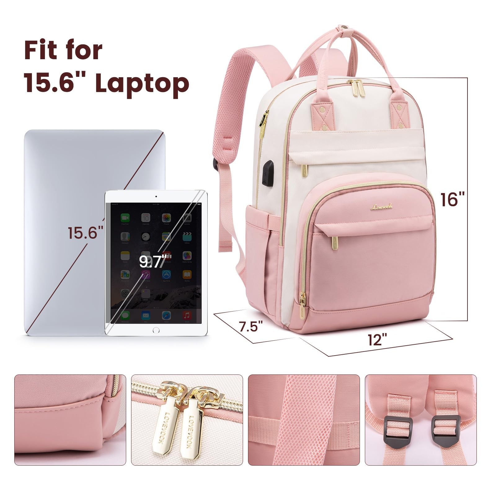 The laptop backpack for women aims for work-life balance. Whether you are digital nomad or professional business woman, except at work, don't forget to exercise and eat healthy to keep fit. The appearance of this women backpack is clean and stylish, allowing women to use it for all occasions, like work, travel or exercise. It's practical for everyday uses. Specification: Size: 12""L 16""H 7.5""D Weight: 1.8lbs; Primary Material: water-resistant nylon. What Storage Spaces This Travel Backpack Has? Separate laptop compartment: holds up to 15.6 inches laptop. Dedicated tablet slot fits up to 12.9 inches iPad. Plus 3 pockets to store mouse, adapter, charging cord and other electronics. Coming with EVA foam padded and Anti-theft lock offer the optimal protection for your devices. Main compartment with 2 storage pockets: can hold A4 folders, magazines, books, clothes, etc. 2 front compartments with many pockets: for keys, earphones, pens and other daily accessories. Backside pocket: to keep phone, wallet, passport or other important things. 2 side pockets: can hold large water bottle or umbrella. Why Our Backpack Comfortable to Wear? Padded back panel and shoulder straps add comfort. Back luggage strap for easy transport. USB Charging Port can charge device eaily on the go. back pack, your practical gift and present for your family, friends who go to travel or work. This large computer backpack suiable for commuting, work, travel or business trip. 【LARGE CAPACITY】One backpack to solve all travel troubles. The large capacity laptop backpack has 6 compartments and more than 26 pockets, which can organize your travel items in an orderly manner, easy for holding laptop, ipads, Phone, binder, water bottle, umbrella, readers, journal, magazine, clothes, pens, wallet and so on.size: 12"L 16"H 7.5"D. weight: 1.8lb. 【LAPTOP PROTECTION】The backpack with laptop compartment has a dedicated separate 15.6-inch laptop pocket, a 9.7-inch iPad slot. The pockets are sewn around with a cushioning material that maximizes physical protection for your laptop. 【USB PORT DESIGN】Great tech design. You can easily connect your phone to the USB port, giving you a more convenient way to charge your phone while walking.(POWER BANK IS NOT INCLUDED) 【COMFY & ANTI-THEFT DESIGN】Mesh airflow shoulder strap design, ergonomic shoulder strap length. Rivet-reinforced double handles, and the pack is reinforced and sewn at every stress point for absolute durability.An Anti-theft Pocket on the back. It is safe guaranteed for protecting your valuable items inside. No need to worry about stolen items. 【LUGGAGE STRAP DESIGN】Backpack for traveling on airplane. Designed for hiking, it helps you free your hands and back from the burden. Make your travel more convenient and enjoyable.Work necessities,college supplies and travel essentials. 【MULTIPURPOSE BACKPACK & QUALITY WARRANTY】This backpack purse is perfect for University, work, travel, business, daily use and outdoor activities. Can be used as University backpack, nurse backpack, work and business backpack.We laptop backpack for women provide a 12-hour customer service, 30-day no-reason return and 1-year warranty policy.