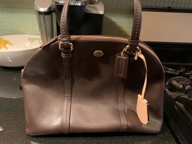Coach Peyton handbag in Dark Brown leather. Has beige lining with zipper and adjustable straps and also can be used as a hand held. Excellent condition.