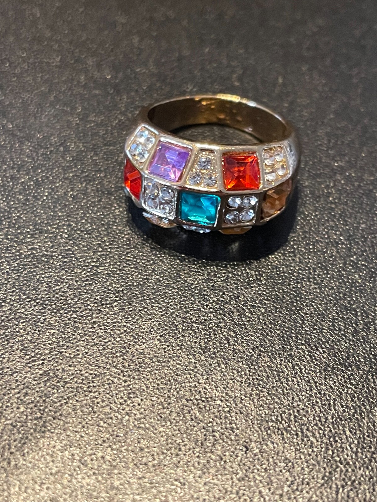 This beautiful gold-coloured ring is the perfect addition to your jewellery collection. With a charm style design and stunning multicoloured main stone, this ring is sure to catch the eye and add a touch of elegance to any outfit. The ring is available in size O and is made with quality metal materials.