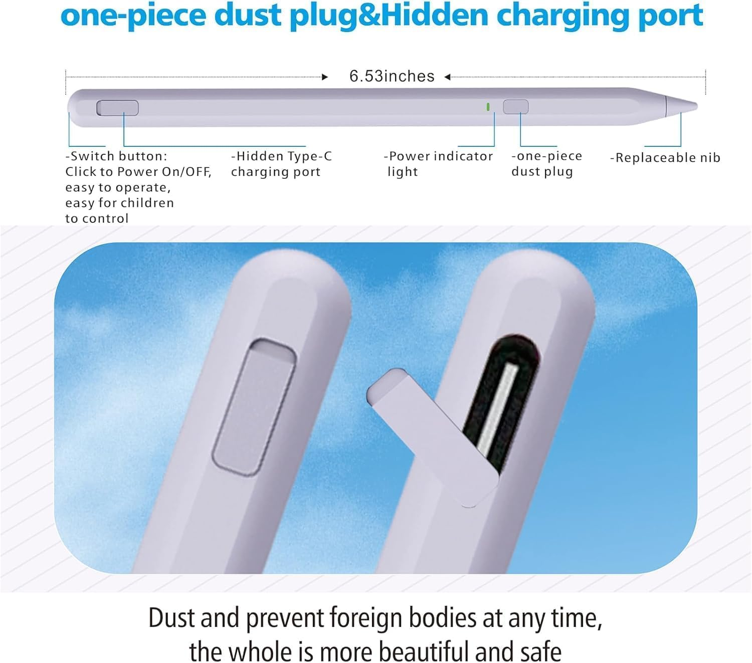 Stylus Pen for Ipad 11Th&10Th Generation, Pen with Pencil Holder,Palm Rejection,For Air11&13"(M2/M3), Pad Pro 11"&13"(M4),Ipad 6-11Th,Ipad Pro 11"/12.9 ", Ipad Air 3/4/5,Mini 5/6 【Smooth&Perfectly Precision】The iPad stylus pen is equipped with a 0.9mm upgraded POM tip, which makes it more sensitive and precise. No lagging, no skips, no scratches, giving you a better experience like a real pencil. the tilt technology makes your writing and drawing more freedom than ever. 【Pencil Holder&One-piece Dust Plug Design】Comes with a pencil holder,Strong adhesive keeps the pencil holder securely in place,holds your pen more securely, allowing you to grab or store the pen quickly and easily.The improved version of the 2025 Apple Pen solves the trouble that the old split dust plug is easy to lose after taking off, and the innovation is improved to the one-piece dust plug. When you need to charge the pen, first remove the one-piece dust plug on the charging hole, insert the charging interface and charge at ease, and you don't have to worry about the small dust plug being lost. 【Palm Rejection&Tilt Sensitivity】- Stylus for iPad pencil 110th generations palm rejection design can free your hands, You can easily use your hands on the screen.Stylus for iPad pencil 11th generations utilizes the latest tilt technology, Tilt function enables you to paint different stroke of thickness and depth by varying stylus pen for iPad tip dip, perfect for drawing or writing on iPad. 【Fast Type C Charging Port & LED Indicators】Compatible with Apple pencil 2nd generation can be fully charged in 40minutes and provides up to 10hours of working time.The iPad pencil also has an LED indicator,green light is on when starting and using, the red light is steady on when charging, and the red light is off when fully charged.And there is no use of the automatic shutdown function within1hour, saving power. 【Easy to Use Stylus Pen&Ideal Gift】- Without any APP required.Single press the button of the stylus to turn on/off easily without connecting via Bluetooth. Only weights 0.42ounce even little kids can use it perfectly! so this apple pen is perfect gifts for children at home learning, drawing, writing, and taking notes. A very good alternative to the more expensive Apple pencil. It is also the Best gift for Christmas, Thanksgiving, Valentine's Day,Mother's Day,Father's Day to your family and friends. 【Compatible with 2018-2025 iPad】Stylus for New 2025 iPad Air 11-inch & 13-inch(M3/M2),iPad Pro 11&13-inch (M4),Pencil for iPad11h/10th/9th/8th/7th/6th Gen, iPad Air 3rd/4th/5th Gen, iPad Pro 11 inches,iPad Pro12.9 inches 3rd/4th/5th/6th Gen,iPad Mini 5th/6th Gen. For models that do not support charging, we have equipped with a Type cable: ⭕❌Not work for iPad pro 1st&2nd, iPad pro 10.5", iPad pro9.7", Earlier versions for iPad, iPhone, Android, Microsoft device. Product Description Item model number AX10S Item dimensions L x W x H 6.53 x 0.39 x 0.39 inches Are Batteries Included Yes Battery Average Life Standby 365 days Color Lavender Color Product Dimensions 6.53 x 0.39 x 0.39 inches Material Aluminum Country of Origin China Compatible Devices function(f) {var _np=(window.P._namespace("DetailPageProductOverviewTemplatesJava"));if(_np.guardFatal){_np.guardFatal(f)(_np);}else{f(_np);}}(function(P) { P.when('A').execute(function(A){ A.on('a:truncate:po-attribute-truncate-6:updated', function(data) { var isTruncated = !data.truncateInstance.getIfTextFits(); var seeMoreElement = document.getElementById('po-attribute-see-more-id-6'); if(seeMoreElement) { seeMoreElement.style.display = isTruncated ? '' : 'none'; } }) }); })); iPad & iPad Pro(2018 -2025), iPad Air 3rd/4th/5th/M2/M3 Gen, iPad Mini 5th/6th Gen, iPad (6th/7th/8th/9th/10th/11th Gen), iPad Pro (11"/12.9"/M4) See more Item Weight 0.42 Ounces Batteries 1 Lithium Ion batteries required. (included) Batteries Required? Yes Number of Batteries 1 Lithium Ion batteries required. (included) 0.39 inches x 6.53 inches x 0.39 inches. Weight: 0.42 oz Shipping from the USA All of our products are shipped from the USA, ensuring quick delivery to your destination. Payment We offer the following payment methods: PayPal, credit card, bank transfer, and eBay's secure payment system. Free Shipping & Free Returns Shipping within the USA is FREE. Additionally, any return is absolutely free for you. Risk-Free Purchase You have the option to return an item within 30 days without any justification. We cover the return shipping costs! Fast Shipping We ship immediately upon receipt of payment. Generally, the package is delivered within 2-3 days in the USA. If it takes longer, we will contact you. Quality and Costs Made in Europe, USA, China No customs fees or additional charges Total satisfaction guarantee Invoice with declared VAT available upon request in .pdf format Feedback Your feedback is very important to us. After you pay for your purchase, you will automatically receive positive feedback from us.
