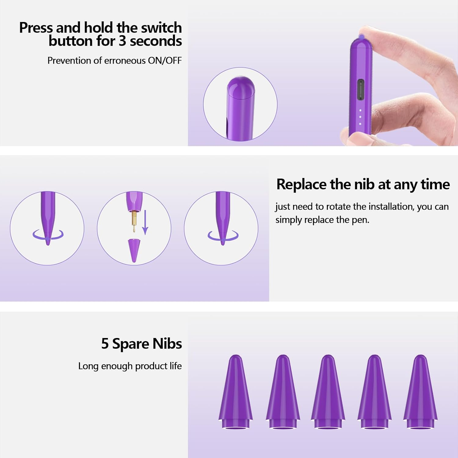 for Ipad Pencil, Pen Compatible with Ipad 20182022, for 10/9/8/7/6/5Th Gen, Pro 11/12.9, Mini 6, Purple 【For iPad Pencil Compatible with 2018-2022 for iPad& for iPad Air& for iPad Pro】Only for iPad series 2018-2022 model: for iPad 10th/9th/8th/7th/6th generation, for iPad Pro 11 (5th/4th/3rd/2nd/1st generation), for iPad Pro 12.9 (6th/5th/4th/3rd generation),for iPad Mini 6th/5th generation, for iPad Air 5th/4th/3rd generation. 【Fast Charging & Battery Capacity Indicator】Fully charged faster than previous for ipad pencil, it only takes 15 minutes to charge and can last up to 12 hours of continuous use. This for iPad pencil displays the battery level via three indicator lights. This new feature makes it easier to determine the remaining battery level than the previous for ipad pencil. 【Easy to Use & High Precision 】No need to connect Bluetooth and install APP, press the top switch button for 3 seconds to power on/off. There will be no disconnection, delay, dislocation and other problems. Using the same pom material tip as the genuine apple pencil reduces friction and protects the screen. 【Palm Rejection Design & Magnet Attach】This for iPad pencil with palm rejection technology, so you can write freely on paper without gloves. Conveniently store your for iPad Pencil on the side of for iPad so you're always ready to use. 【Tilt Sensitive】The stylus pen for ipad can change line thickness or add various artistic effects like a apple pen, while maintaining pixel-level precision.(Note: Tilt detection function is compatible with software: SketchBook, Procreate, Paper, Noteshelf). Product Description Product packaging 1* iPad Stylus Pencil, 1* USB-C charging cable, 1* User Manual, 5* Replaceable Tips Warm Tips: 1. Need turn off bluetooth before using it, If you have connected the "Apple pen". 2. Check the ipad setting and turn off the "Drawing with Apple Pencil only" option. Compatible with iPad 2018/ 2019/ 2020/ 2021/ 2022 iPad 10th Gen 10.9" - 2022 A2696/ A2757/ A2777 iPad 9th Gen 10.2" - 2021 A2602/ A2603/ A2604/ A2605 iPad 8th Gen 10.2" - 2020 A2270/ A2428/ A2429 iPad 7th Gen 10.2" - 2019 A2197/ A2200/ A2198 iPad Air 5th Gen 10.9" - 2022 A2588/ A2589/ A2591 iPad Air 4th Gen 10.9" - 2020 A2316/ A2324/ A2325/ A2072 iPad Pro 11" 4th Gen - 2022 A2435/ A2761/ A2762 iPad Pro 11" 3rd Gen - 2021 A2377/ A2459/ A2301/ A2460 iPad Pro 11" 2nd Gen - 2020 A2228/ A2068/ A2230/ A2231 iPad Pro 11" 1st Gen - 2018 A1980 /A2013/ A1934/ A197 iPad Pro 12.9" 6th Gen - 2022 A2436/ A2437/ A2764/ A2766 iPad Pro 12.9" 5th Gen - 2021 A2378/ A2461/ A2379/ A2462 iPad Pro 12.9" 4th Gen - 2020 A2229/ A2069/ A2232/ A2233 iPad Pro 12.9" 3rd Gen - 2018 A1876/ A2014/ A1895/ A1983 iPad Mini 6th Gen 8.3" - 2021 A2567/ A2568/ A2569 iPad Mini 5th Gen 7.9" - 2019 A2133/ A2124/ A2126/ A2125 Batteries Required? Yes Are Batteries Included No Color Purple Material Aluminum Country of Origin China Compatible Devices for iPad Item Weight 41 Grams Battery Average Life Standby 12 Hours Charging Time 15 minutes Battery Description Lithium-Ion Polymer Package Dimensions 8.23 x 2.32 x 0.75 inches 2.32 inches x 8.23 inches x 0.75 inches. Weight: 41.0 grams Shipping from the USA All of our products are shipped from the USA, ensuring quick delivery to your destination. Payment We offer the following payment methods: PayPal, credit card, bank transfer, and eBay's secure payment system. Free Shipping & Free Returns Shipping within the USA is FREE. Additionally, any return is absolutely free for you. Risk-Free Purchase You have the option to return an item within 30 days without any justification. We cover the return shipping costs! Fast Shipping We ship immediately upon receipt of payment. Generally, the package is delivered within 2-3 days in the USA. If it takes longer, we will contact you. Quality and Costs Made in Europe, USA, China No customs fees or additional charges Total satisfaction guarantee Invoice with declared VAT available upon request in .pdf format Feedback Your feedback is very important to us. After you pay for your purchase, you will automatically receive positive feedback from us.