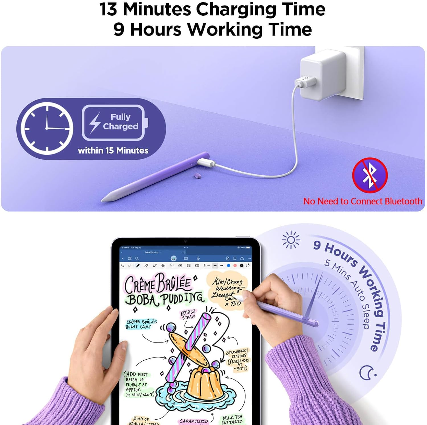 【For iPad 2018-2024】No need to connect to Bluetooth.This ipad pencil is compatible with Apple iPad 2018-2024. This Pencil for iPad 10th /9th /8th /7th /6th; iPad Pro 11 inch /12.9 inch; iPad Mini 5th /6th; iPad Air (5th /4th /3rd); New iPad Pro 2024 11 inch &13 inch (M4); New iPad Air 2024 11 inch &13 inch (M2). Not compatible with iPad Pro 12.9 inch(2th /1st), iPad Pro 10.5/9.7 inch(4th /3rd /2nd /1st), iPad 5th/ 4th /3rd /2nd /1st, iPad air 2nd /1st, iPad Mini 4th /3rd /2nd /1st.And it's easy to use! Double-click the top touch control to turn it on.This iPad pen is magnetically adsorbed and can be attached to the iPad when not in use. 【15 Mins Fast Charging, 9 Hours of Use】 No need to charge frequently. Experience uninterrupted creativity with our iPad pencil lightning-fast charging capabilities. 2X Faster Charging speed than others. Just 15 minutes of charging provides an impressive 9 hours of continuous usage, long lasting battery life.This ensures that your creative process is not interrupted. You can use it all day long. 【Effortless Palm Rejection】Bid farewell to distractions during your artistic endeavors. Our stylus pen Compatible with Apple iPad Pencil 1st / 2nd Generation with advanced palm rejection technology ensures seamless drawing experiences, allowing you to focus solely on your masterpiece without any unwanted interruptions. 【Multiple Replaceable Long-lasting Nibs】- The nibs of our iPad pens are extremely long-lasting and will last a long time without wear and tear. And we also come with 4 replaceable pen tips. And it's very easy to replace the nib. This ipencil looks great and has a stylish design. Our iPad Pencil features cutting-edge ergonomics that provide a comfortable grip and fit seamlessly into your hand. Its balanced weight and intuitive design ensure fatigue-free use. 【Versatile & Easy to Carry】 - you can use it to take notes, draw, write, create art and more. You can also use iPad pro pencil for daily use, classroom use and work use. This ipencil is a great gift for your children to use for taking notes in school classes. This is the best gift for your colleague/client for work or meetings. The best gift for your friend for creation and painting practice. Put it in your pocket or purse and carry it to any place - school class, university, office, airplane... 【Exceptional Accuracy & 24H-Friendly Service】Enjoy unparalleled precision in your drawings with our stylus iPad pen outstanding accuracy. Whether you're sketching, annotating, or illustrating, every stroke is captured with impeccable detail, allowing your creativity to flourish.We provide 24H-Friendly Service. Our team is here to assist you promptly whenever you need it. Product Description 1 4 Replacement Tips 2 Tilt Sensitivity 3 Magnetic Adsorption 1 Painting/Drawing 2 Taking Notes 3 Working 4 Playing Game