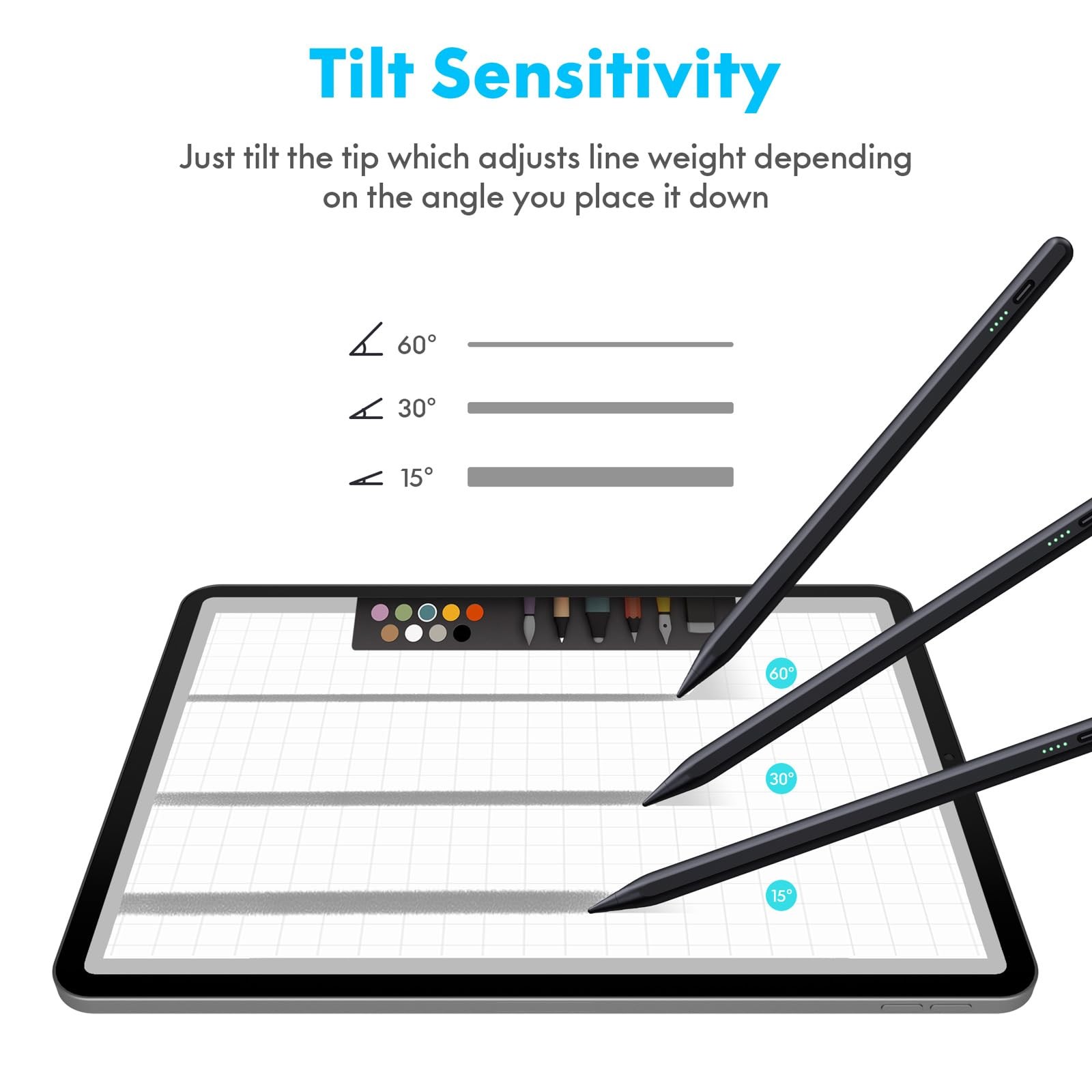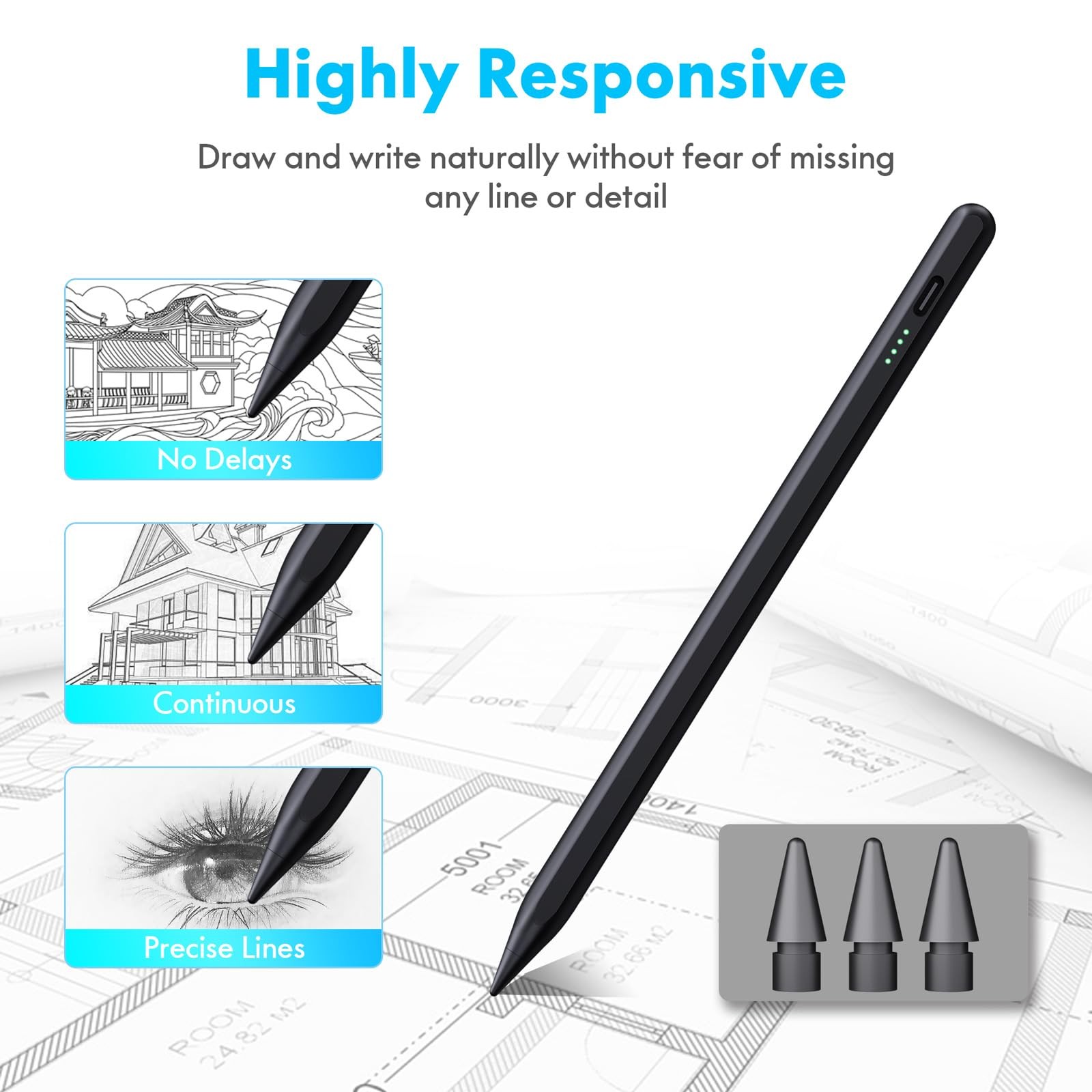 stylus pen for iPad Design for iPad 2025-2018: Special stylus pen only supports iPad 2018 release or later models.Compatible with iPad Pro 11/13-Inch M4,iPad Air 11/13-Inch M2/M3,iPad 11th/10th/9th/8th/7th/6th Gen, iPad Air 5th/4th/3rd Gen, iPad Pro 12.9" (6th/5th/4th/3rd Gen), iPad Mini 7th/6th/5th. NOTE: Please check the correct iPad model before you order it Pixel-perfect Precision: Equipped with a 1.5mm upgraded original tip for precise and steady control,all as natural as a real pencil, high responsive, no skips, no lagging, no noise. Comes with extra 3pcs premium replaceable tips Touch Switch & Fast Charge: Just double touch the top to turn on the stylus pen. 30 minutes per charge (Type-C Cable included) supports 8 hours working and 30 days standby time.It will automatically enter sleep mode after 30 minutes of inactivity to save power.With 4 indicator lights, it provides clear and convenient power display Tilt Sensor: Featured with tilt sensor function allows you to draw different stroke of thickness and depth by altering the tip inclination, perfect for drawing, sketching and note-taking on iPad.No Pressure Sensitivity Palm Rejection & Magnetic Attach: Place your palm on the screen to enjoy the freedom writing or drawing.Also can be attached to the side of iPad for storage to prevent rolling or losing when idle,easily carry and retrieve it at any time