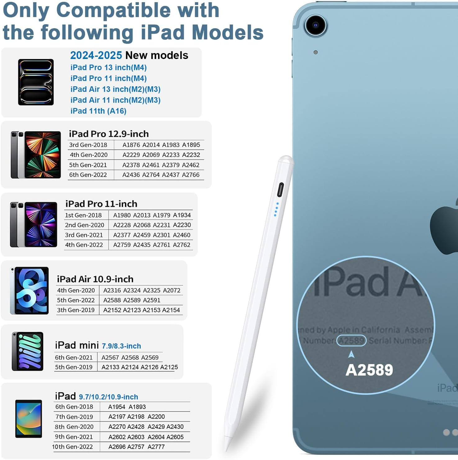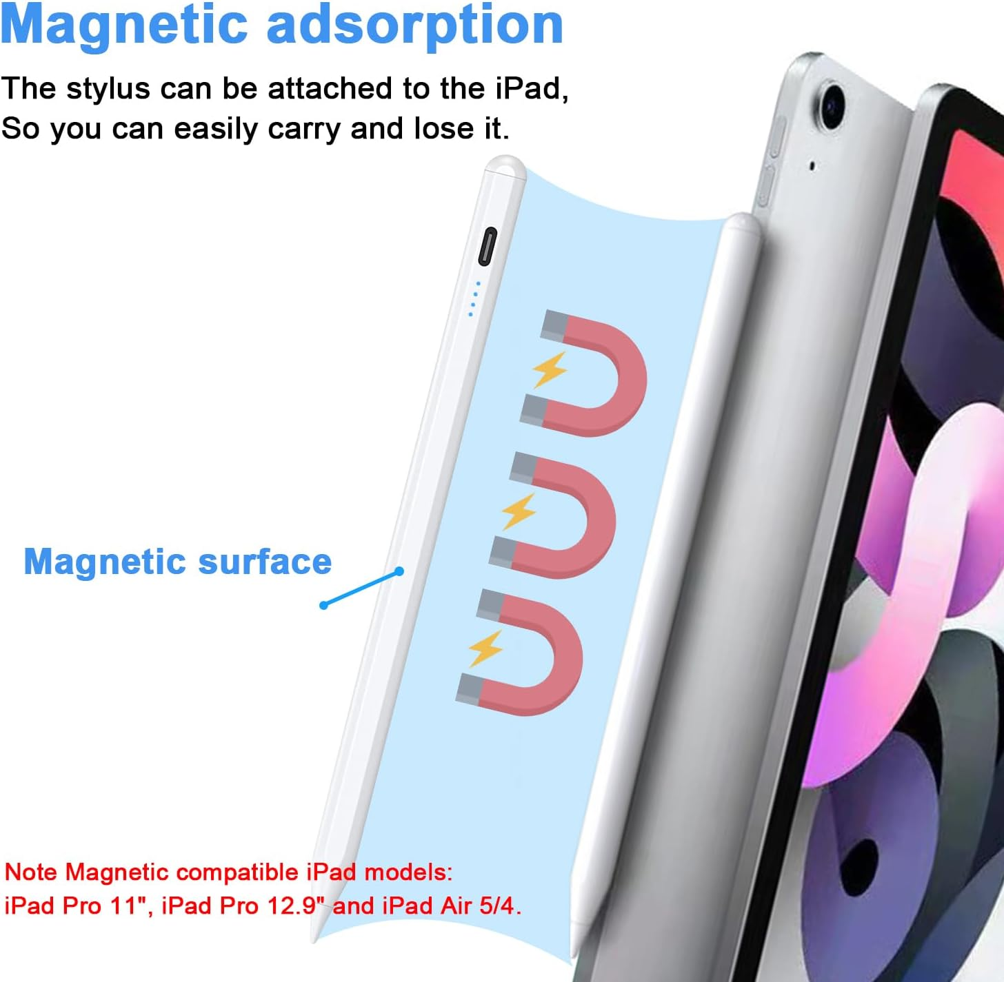【Compatible with iPad only】 This iPad Pencil only supports the iPad (2018-2025) series, iPad Pen is compatible with iPad 11(A16)/10/9/8/7/6, iPad Air 3/4/5/M2/M3, iPad Pro 11-inch 1/2/3/4/M4, iPad Pro 12.9-inch 3/4/5, iPad Pro 13" (M4), iPad Mini 5/6 Gen. 【Note】 This iPad pen is Not compatible with iPad models prior to 2018, Not compatible with iphones, Not compatible with Android or Windows phones and tablets. Please confirm model compatibility before placing an order 【Power display/Palm Rejection】 The active stylus pen for iPad has 4 power indicators, each representing 25% power, so you can watch your battery consumption progress in real time so you can recharge before important work begins. This iPad pencil has palm rejection. You don't have to worry about putting your hand on the Tablet to prevent the iPad Tablet Pen from writing, which effectively prevents the palm from interfering with the stylus, so you can write and draw more freely 【Tilt sensitivity /POM tip】 The stylus pen has tilt sensitivity, which can simulate the different thickness of the line texture when drawing with pencil on iPad notes, making the painting more realistic. 【Note】Pressure sensing is Not supported. The stylus pen tips is made of the same POM material as the A-ple Pencil, making it accurate and sensitive writing. 【Nibs】This ipad air pencil set comes with 4 additional replacement nibs to extend the life of the pen 【Smart Touch Switch/Magnetic function】 The stylus only needs to be turned on and off by just double-tapping the top switch, no Bluetooth/app connection required. The front of the iPad stylus has a magnetic clip function, so you can attach the stylus to your iPad when you're at work or on business. Magnetic compatible iPad models: iPad Pro 11", iPad Pro 12.9" and iPad Air 5/4 【Type-C Charging Design】 This iPad stylus pencil uses the latest popular Type-C charging port on the market to make it easier for you to charge while you work. The stylus pen for ipad takes 20 minutes to charge and 8 hours to use 【After-sales Protection】 What do you get? You can get 1*Active Stylus Pen, 4*POM replacement tips, 1*Tyep-C charging cable, and 1*English manual. Our dogain iPad pencil provides 12 months service, if there is a problem with the product can contact us, our team will give you a reply within 24 hours Product Description 1 Palm Rejection 2 Tilt Function 3 Magnetic Adsorption