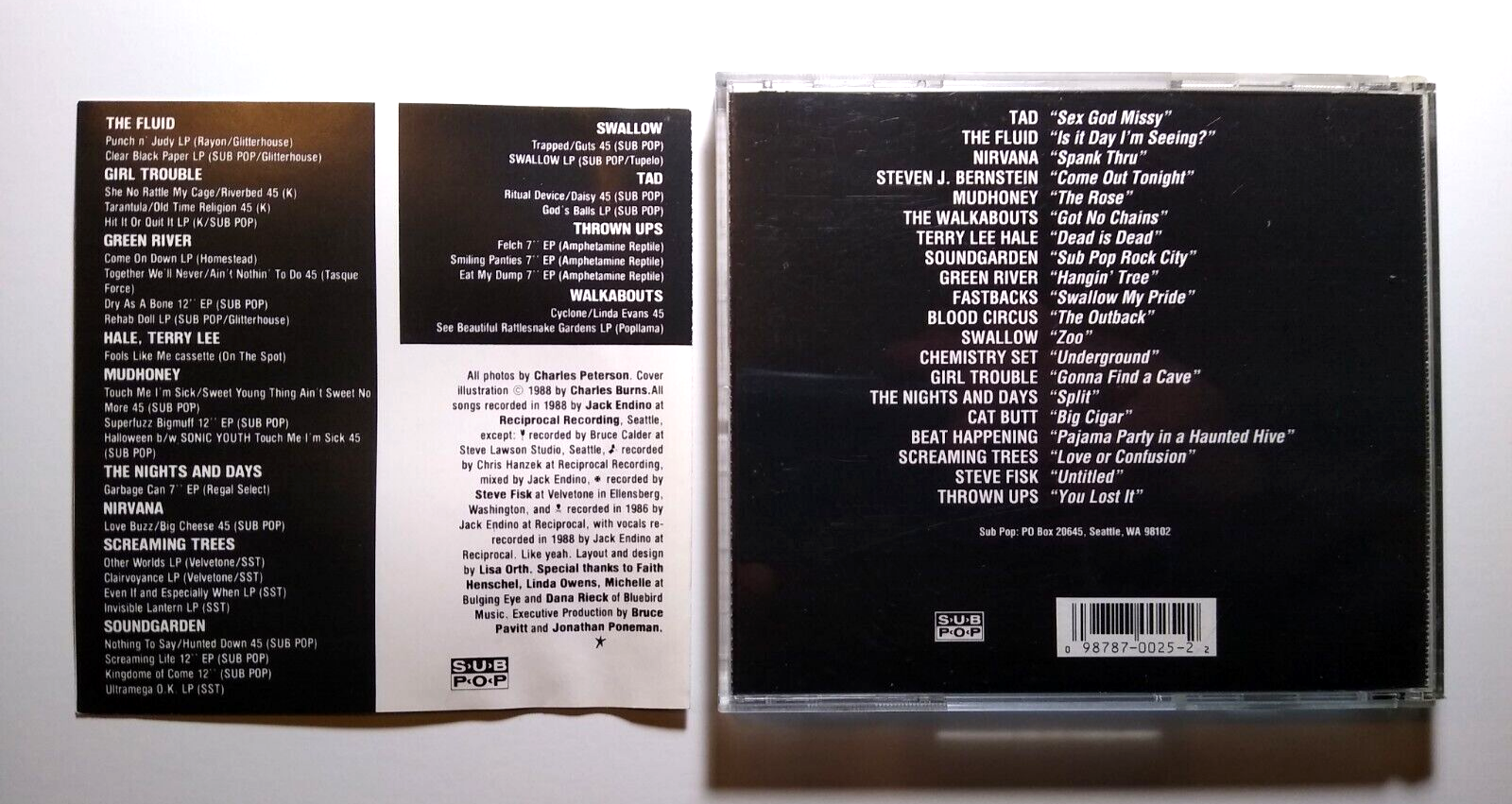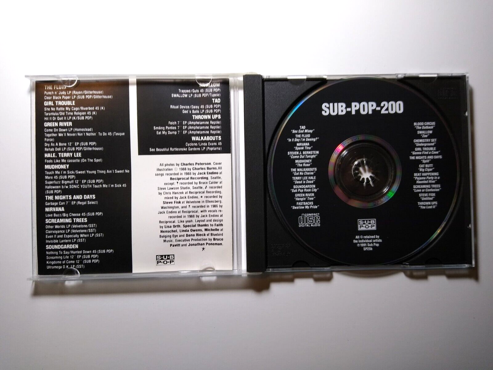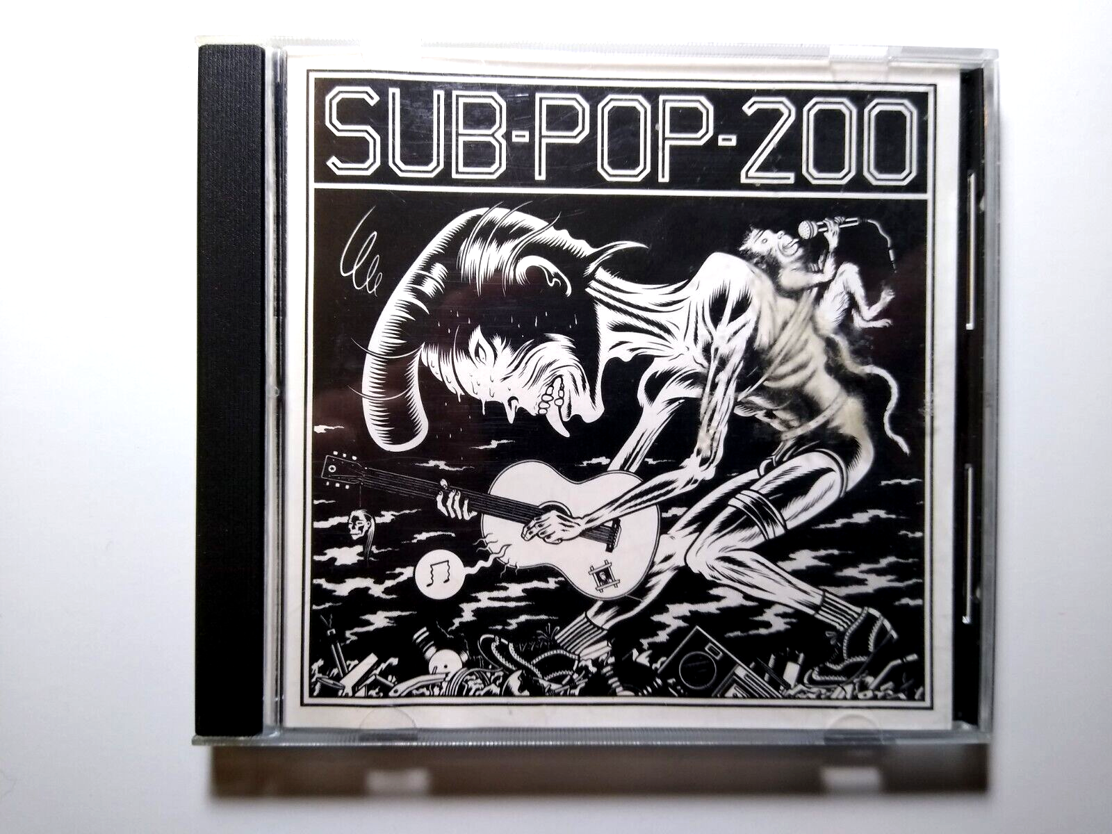VERY RARE EDTION that does not list Caroline Distribution as distribution on the back. CD is shiny and clean with light age and plays fine. Case has scuffs and age wear. Insert was stuck together in the corner and has some damage as shown. "Sub-Pop 200" is a CD album released in 1991 by Sub Pop Records. It features various alternative rock artists including Nirvana and Soundgarden. The CD comes in a standard jewel case with a silver color. This first edition album includes the original cover and is from the United States, reflecting the 1990s music style.