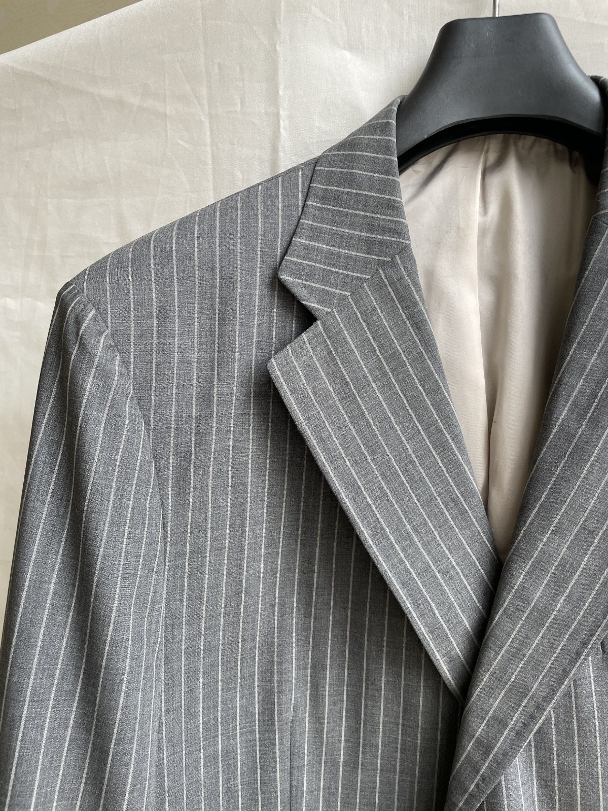 Suitsupply Half Lined Striped Dark Gray Wool Blazer Good pre-owned condition, has small hole in back Size UK/US 48R/ EUR 58R Measures: Shoulders 51 cm/ 20 in Pit to pit 61 cm/ 24 in Sleeve from shoulder 65 cm/ 25.5 in Length in back 84 cm/ 33 in + collar All items are measured laying flat