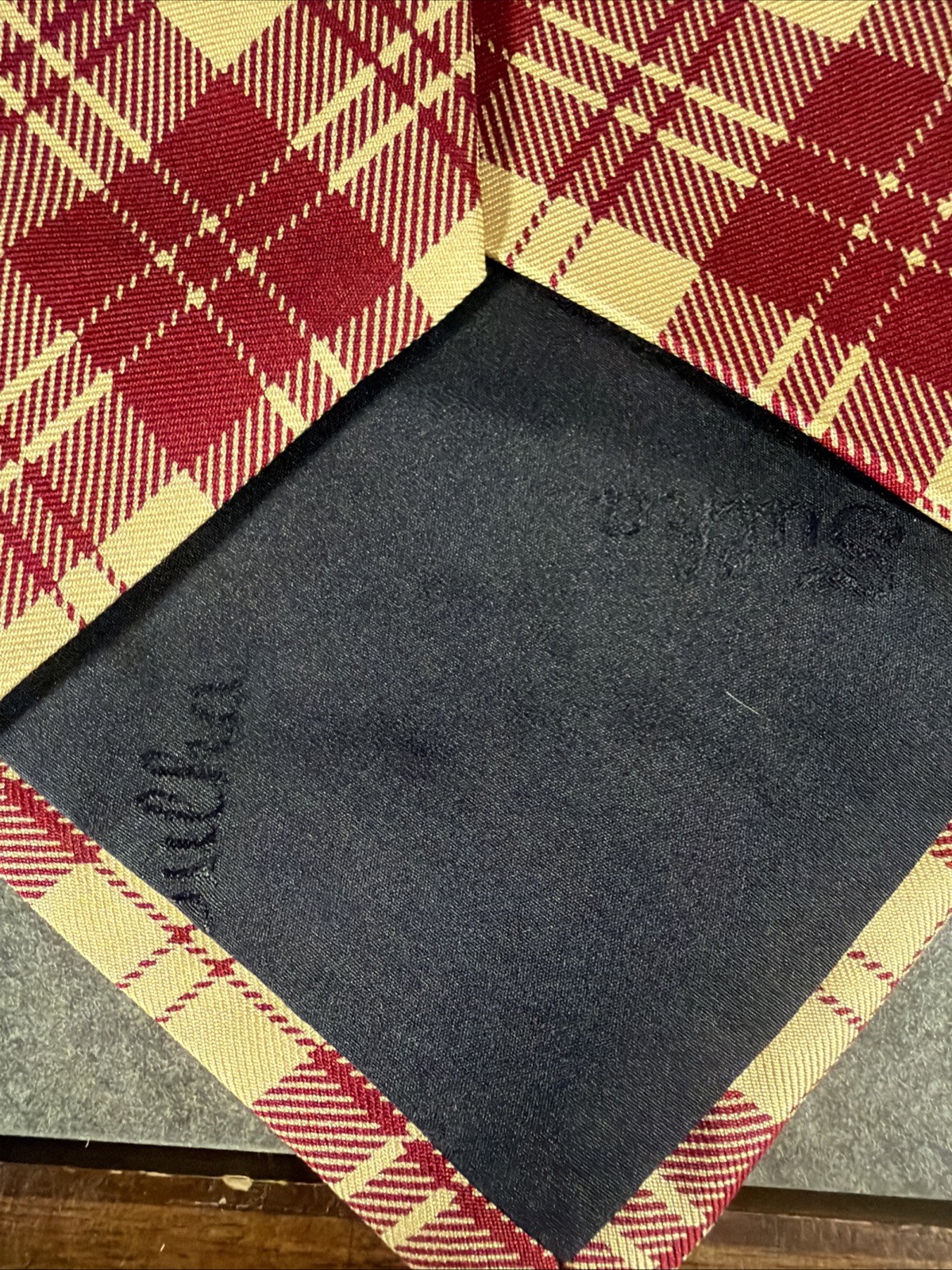 This Sulka New York London Paris tie is a high-quality designer accessory for men. Made in France, the burgundy and cream plaid silk necktie exudes sophistication and style. The adjustable tie features classic dimensions of 57"-60" in length and a classic width, making it a versatile and timeless addition to any man's wardrobe. Perfect for formal occasions or adding a touch of elegance to a professional outfit, this tie embodies luxury and refinement.