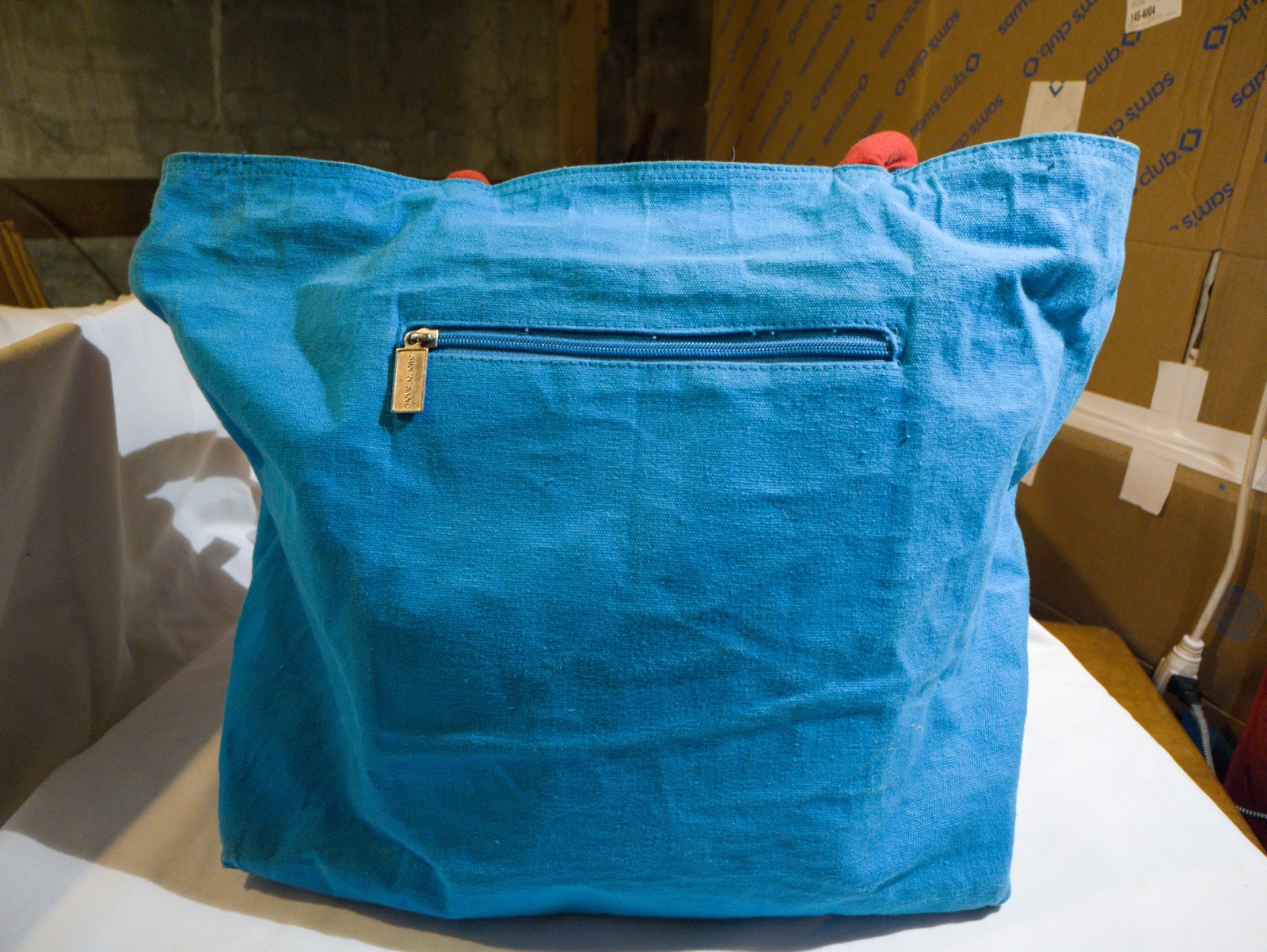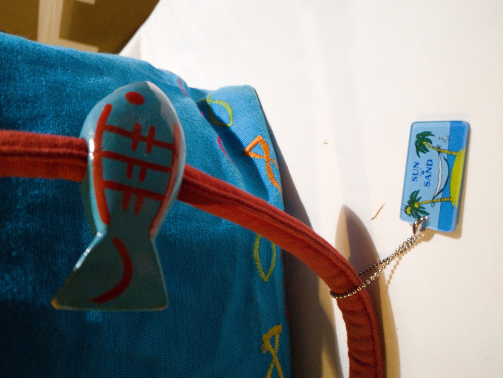 The Sun & Sand Canvas Tote is a large square-shaped travel bag with a zip closure and red double handles. It features embroidered tropical patterns in aqua canvas, with silver hardware accents. This stylish tote is perfect for beach occasions and includes inner pockets, a pool floatie accessory, and a charming bag charm. Made by the brand Sand N Sun, this tote is both functional and fashionable for women looking for a vibrant and whimsical beach-themed handbag.