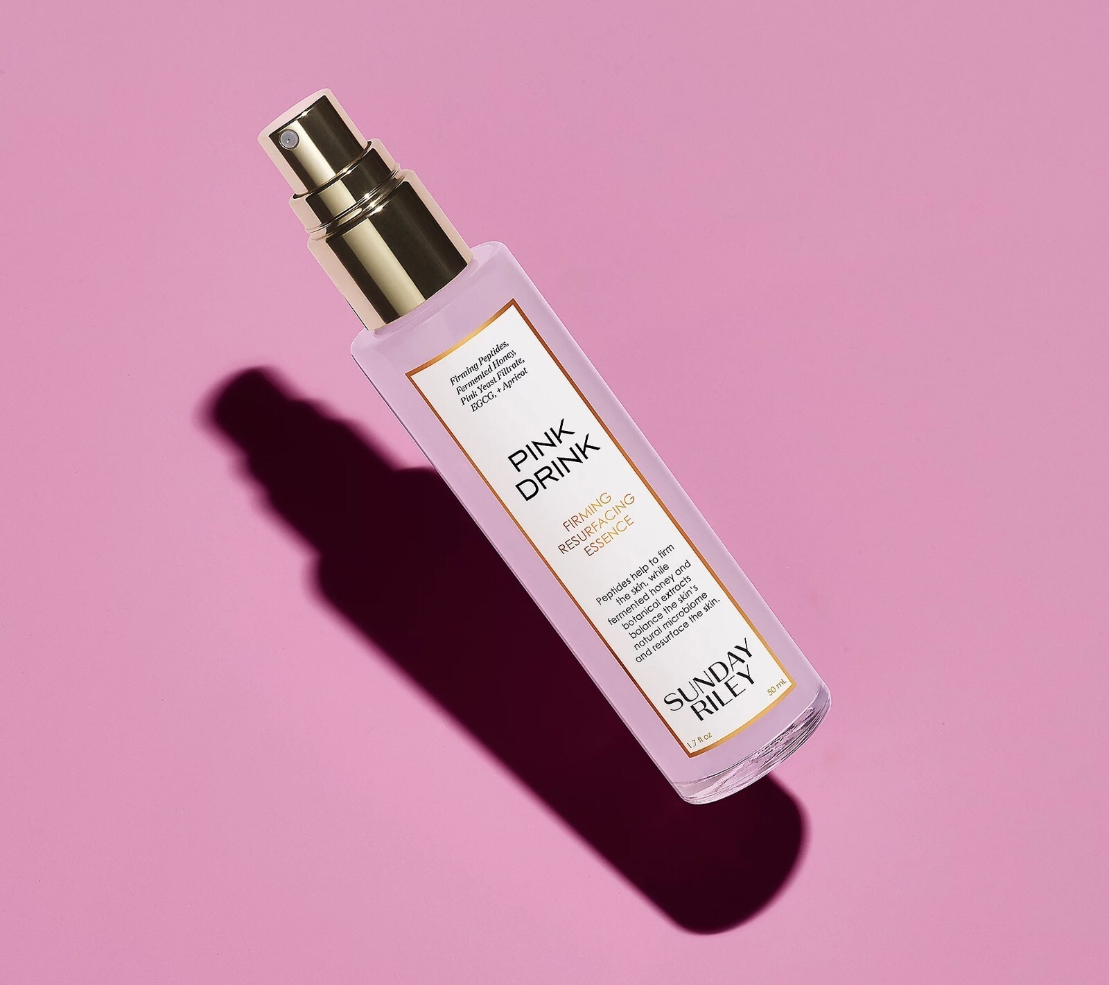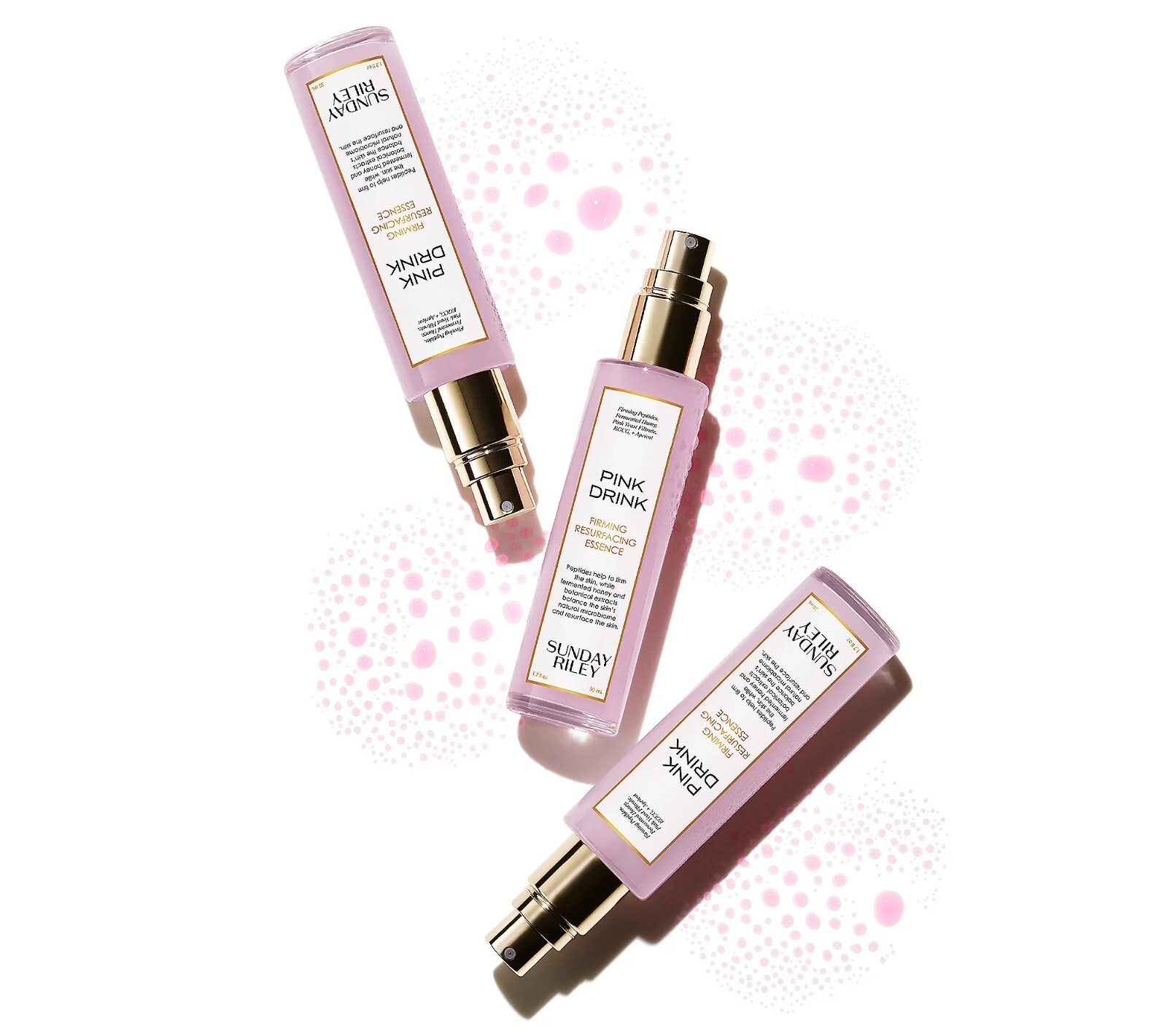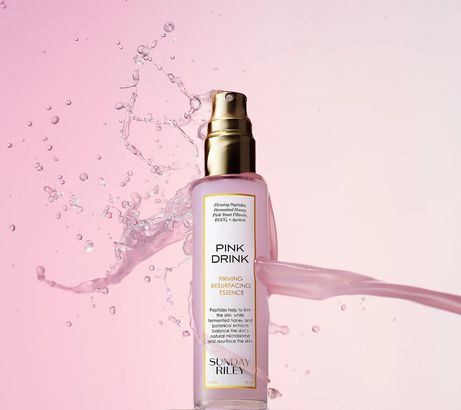 Sunday Riley Pink Drink Firming Resurfacing Essence is a drink for your skin that's formulated with honey, pink yeast filtrate, chlorella, kelp, Acetyl Tetrapeptide-9 and Acetyl Tetrapeptide-11, apricot and cucumber extracts, EGCG and ceramides. Your skin is left feeling renewed and soft. How do I use it: As a first step in your treatment routine, apply to dry skin, after cleansing. Can be misted directly on the face or sprayed into the palm of the hand and patted onto skin. Can be used morning and night, before serums, oils, and moisturizer. From Sunday Riley. Includes: 1.7-fl oz Pink Drink Firming Resurfacing Essence
