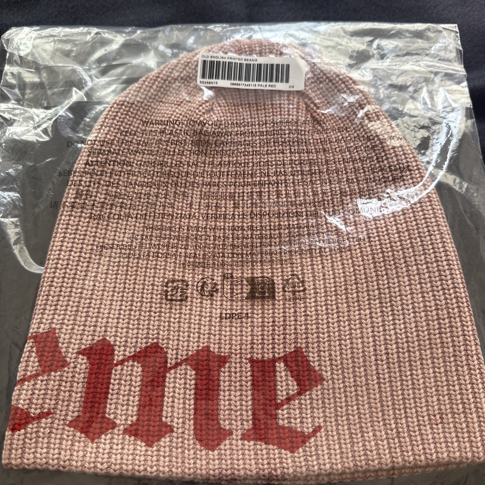 Supreme Old English Printed Beanie Red One Size SS25. Item is brand new, in original packaging and is 100% Authentic. Released for the Supreme Spring/Summer '25 Collection. Please feel free to reach out if there are any questions.