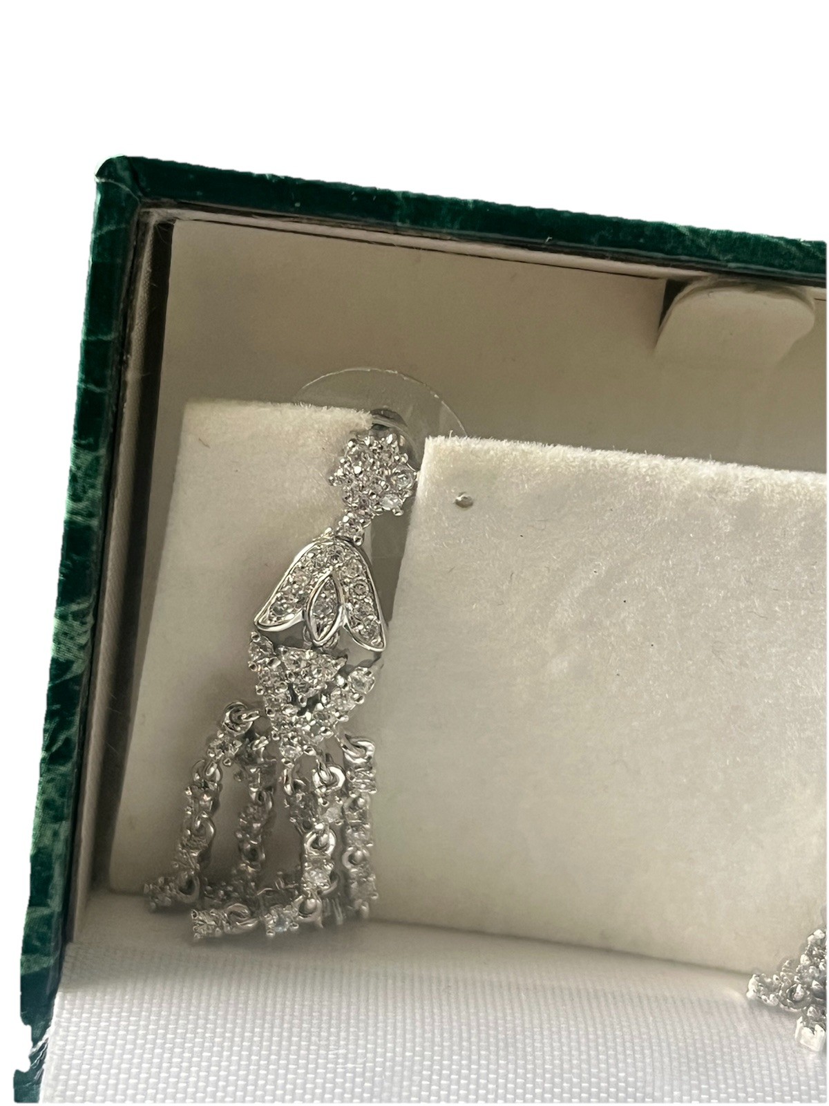 Elegant crystal tassel earrings from the Suzanne Somers Collection, featuring a sparkling clear crystal top with cascading silver-tone chain fringe. The dangling tassel design creates beautiful movement and light reflection, making these earrings perfect for evening wear, parties, or special occasions. They come in the original Suzanne Somers branded presentation box, ideal for gifting or collecting. Lightweight and comfortable to wear, with secure post backs for pierced ears. A stylish vintage fashion jewelry piece from the late 1990s / early 2000s era.