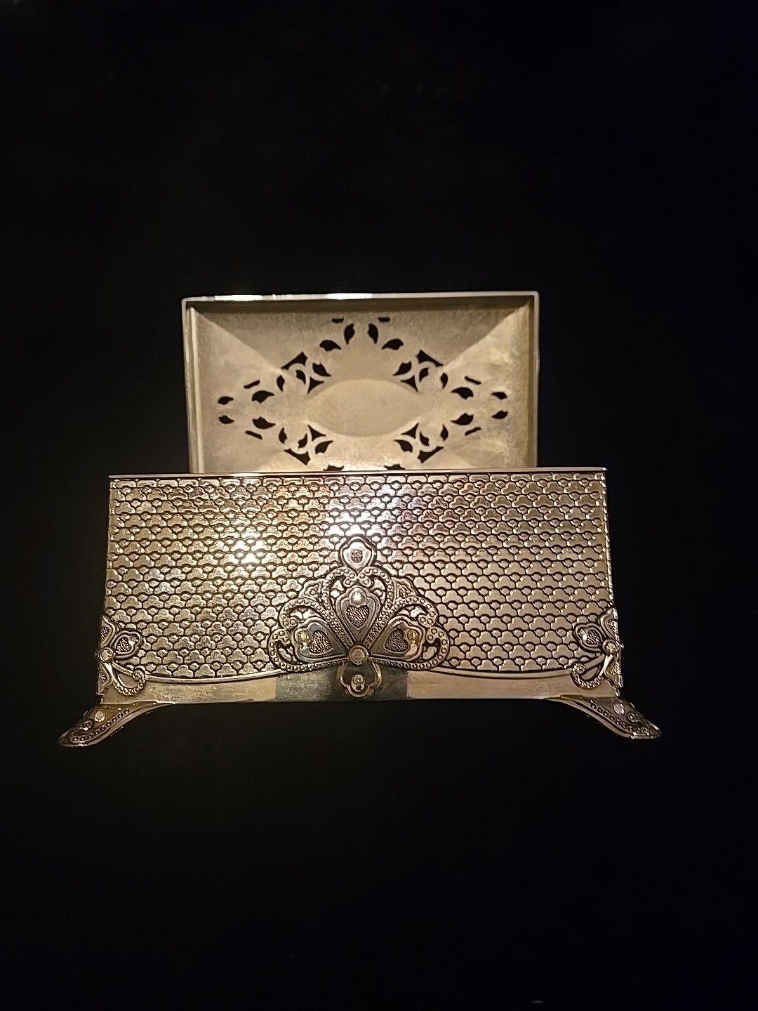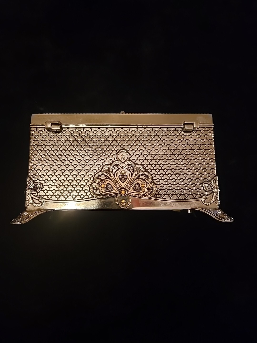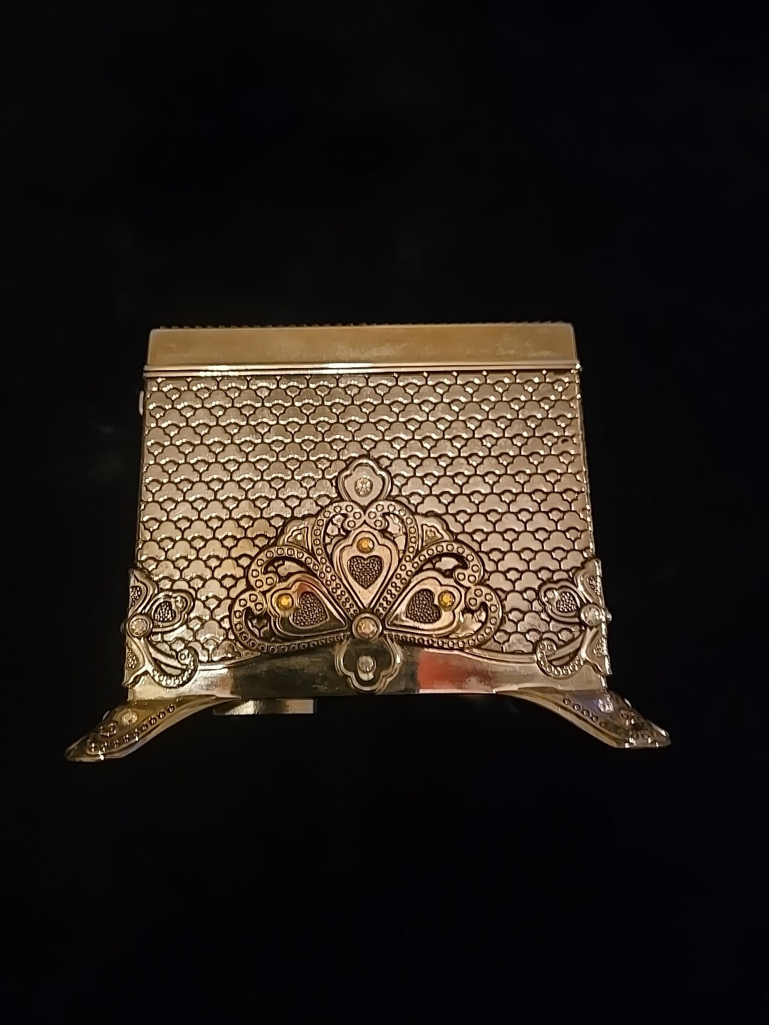 Item is used wear is very low . Little staining on inside , wind up music works and sound clear. Box is 4 X 4 X 6.500