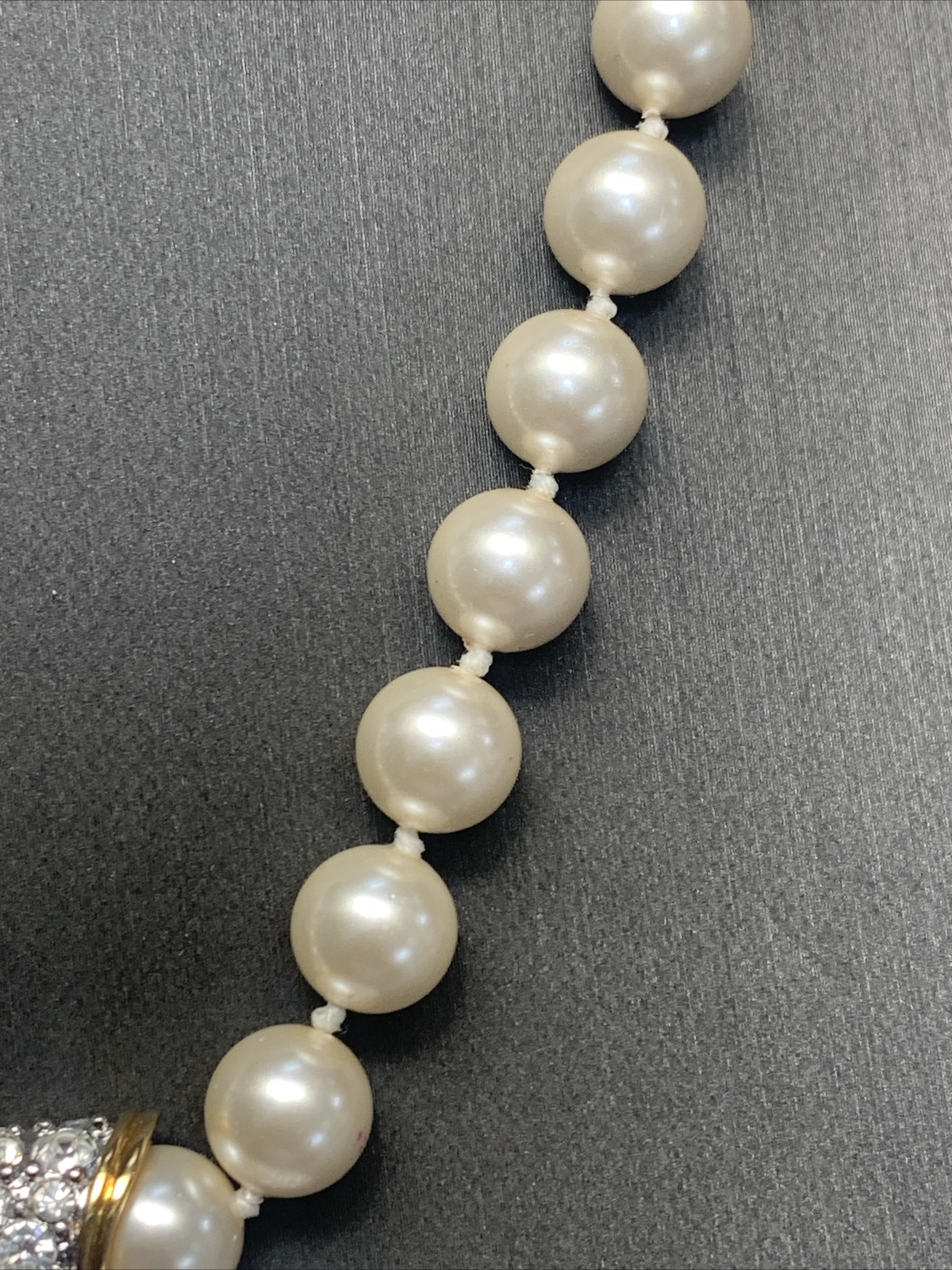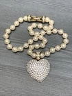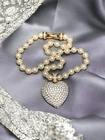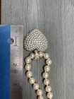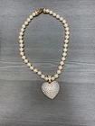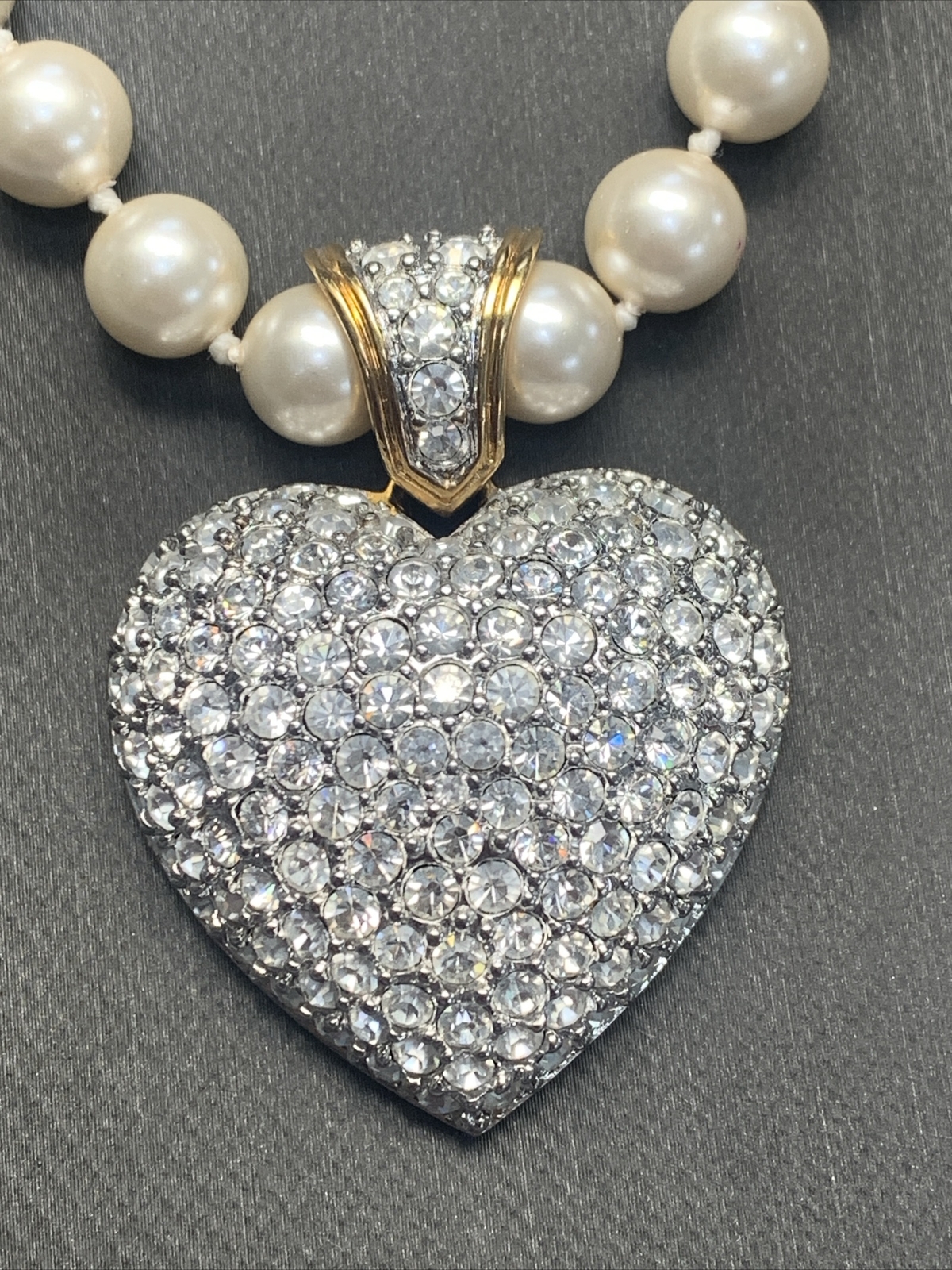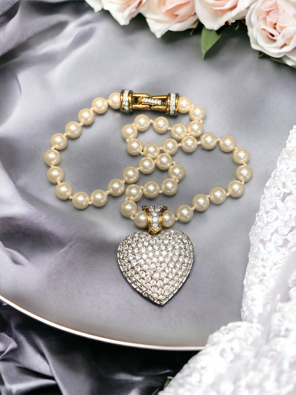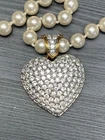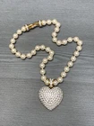 This Swarovski necklace is the perfect accessory for any special occasion. The large crystal heart pendant is surrounded by pearls and the fancy crystal clasp adds an elegant touch. The necklace measures 15 inches and is signed by the renowned Swarovski brand. The clear color of the crystal and excellent cut grade make this piece truly stunning. This necklace is in mint condition and Wedding or event ready . Choker length on most . The chain type is beaded and the necklace can be worn in a variety of styles including as a statement piece, choker or collar. The vintage style adds a touch of nostalgia to the necklace, making it a perfect choice for engagement, wedding or anniversary celebrations. The necklace comes in a cotton lined white box and is made of high-quality materials including crystal and glass pearls .