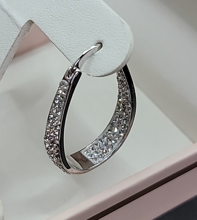 Add a touch of elegance to your outfit with these beautiful hoop earrings. Made with high-quality silver plating and adorned with sparkling crystals from Swarovski, these earrings are perfect for any occasion. The intricate design and white/colorless crystal stones give them a timeless appeal. These earrings are perfect for those who love to make a statement with their jewelry.