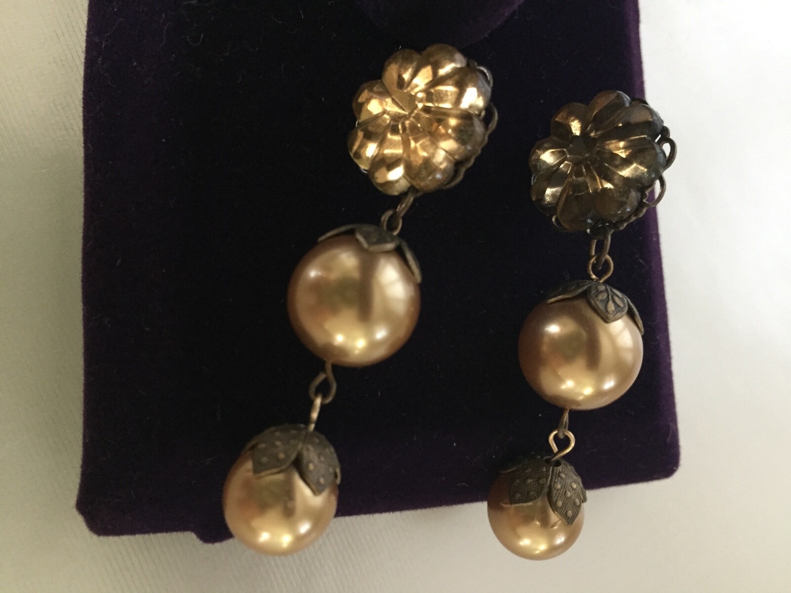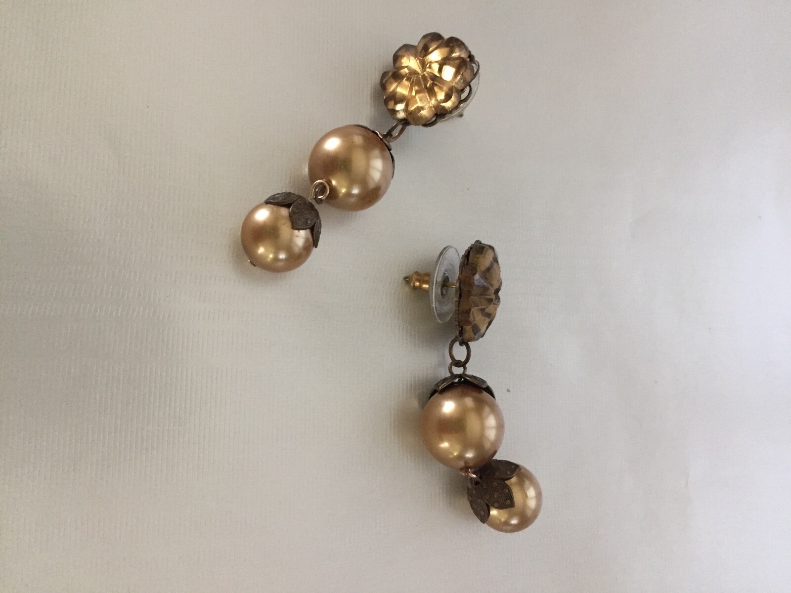 Earrings with Swarovski copper-colored pearls brass bead caps and crystal cabs pierced. Condition is Pre-owned. Shipped with USPS First Class Package.