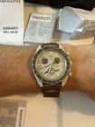 The Swatch x Omega Bioceramic Moonswatch Mission To Saturn 42 mm Beige is a luxurious and sporty wristwatch designed for men or women Featuring a beige case color and brown bezel and band, this timepiece exudes a sophisticated and stylish appeal. With Swiss-made quartz movement, water resistance up to 30 meters, and a chronograph feature, this watch is both practical and reliable for everyday wear. The unique design, including stick and baton indexes, tachymeter bezel, and snap caseback, sets it apart as a timeless and high-quality accessory for any occasion. There is one minor scratch on the dial (see pictures). It is barely noticeable. I will also include the extra brown nato strap as well. This has been worn less than 10 times.