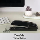 Swingline Stapler, Office Desk 20 Sheet Paper Capacity, 20, Black Product Details Manufacturer: ACCO Brands Brand: Swingline Item Weight: 0.96 ounces Product Dimensions: 1.9 x 7.5 x 2.3 inches Item model number: S7064601E Is Discontinued By Manufacturer: No Color: Black Material Type: Metal Number of Fasteners: 210 Number of Items: 1 Size: 20 Manufacturer Part Number: 64601 Brand: Swingline Color: Black Material: Metal Number of Fasteners: 210 Style: Heavy Duty,Classic DURABLE STAPLER – This desktop stapler is designed for long-term durability and consistent performance, constructed with a strong metal base and a sturdy plastic top. DESIGNED FOR DESKTOP – This stapler is intended for desktop use. It holds a full strip of 210 staples. A helpful low-staple indicator lets you know when it's time for a refill. SECURES 20 SHEETS – This high-performing stapler fastens up to 20 sheets of paper and works best with standard sized Swingline S.F. 4 Premium Staples. Staples have standard 1/4"" length legs. COMFORTABLE TO USE – A classic smooth finish combines with a sleek, contoured design for comfort and ease of use. Product Description The sturdy Swingline 646 Durable Desk Stapler is reliable, built with a metal base and a plastic top for long-lasting service. It's designed for desktop use, but is also great for tacking and pinning paper. This high quality stapler holds a full strip of 210 staples. A helpful low-staple indicator lets you know when it's time for a refill. Stapler securely fastens up to 25 sheets of paper and works best with 1/4" leg length standard sized Swingline S.F. 4 Premium Staples. Opens for tacking so you can easily tack up items such as flyers and posters on soft surfaces. Adjustable anvil, the metal plate at the base of the stapler, rotates to create temporary staples that point out for easy removal from documents. Contoured design couples with a classic smooth finish to enhance your comfort. Swingline backs this high-quality stapler with a limited lifetime warranty. The Swingline S7064601E Deluxe Desk Stapler comes with an all-metal die-cast base for durability and stability, and an integrated tie plate for long-lasting stapling integrity. A smooth form and finish is also included for precise and comfortable hand-held applications. Backed by a limited lifetime manufacturer's warranty, the stapler can handle jobs of up to 20 sheets of 20-pound paper when used with Swingline's S.F. 4 premium staples.