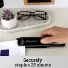 Swingline Stapler, Office Desk 20 Sheet Paper Capacity, 20, Black Product Details Manufacturer: ACCO Brands Brand: Swingline Item Weight: 0.96 ounces Product Dimensions: 1.9 x 7.5 x 2.3 inches Item model number: S7064601E Is Discontinued By Manufacturer: No Color: Black Material Type: Metal Number of Fasteners: 210 Number of Items: 1 Size: 20 Manufacturer Part Number: 64601 Brand: Swingline Color: Black Material: Metal Number of Fasteners: 210 Style: Heavy Duty,Classic DURABLE STAPLER – This desktop stapler is designed for long-term durability and consistent performance, constructed with a strong metal base and a sturdy plastic top. DESIGNED FOR DESKTOP – This stapler is intended for desktop use. It holds a full strip of 210 staples. A helpful low-staple indicator lets you know when it's time for a refill. SECURES 20 SHEETS – This high-performing stapler fastens up to 20 sheets of paper and works best with standard sized Swingline S.F. 4 Premium Staples. Staples have standard 1/4"" length legs. COMFORTABLE TO USE – A classic smooth finish combines with a sleek, contoured design for comfort and ease of use. Product Description The sturdy Swingline 646 Durable Desk Stapler is reliable, built with a metal base and a plastic top for long-lasting service. It's designed for desktop use, but is also great for tacking and pinning paper. This high quality stapler holds a full strip of 210 staples. A helpful low-staple indicator lets you know when it's time for a refill. Stapler securely fastens up to 25 sheets of paper and works best with 1/4" leg length standard sized Swingline S.F. 4 Premium Staples. Opens for tacking so you can easily tack up items such as flyers and posters on soft surfaces. Adjustable anvil, the metal plate at the base of the stapler, rotates to create temporary staples that point out for easy removal from documents. Contoured design couples with a classic smooth finish to enhance your comfort. Swingline backs this high-quality stapler with a limited lifetime warranty. The Swingline S7064601E Deluxe Desk Stapler comes with an all-metal die-cast base for durability and stability, and an integrated tie plate for long-lasting stapling integrity. A smooth form and finish is also included for precise and comfortable hand-held applications. Backed by a limited lifetime manufacturer's warranty, the stapler can handle jobs of up to 20 sheets of 20-pound paper when used with Swingline's S.F. 4 premium staples.