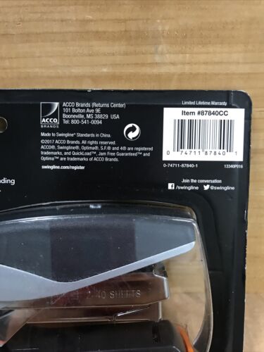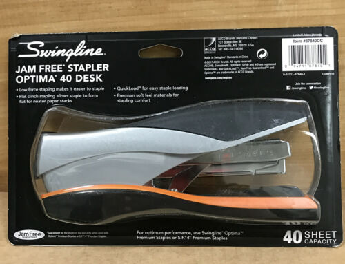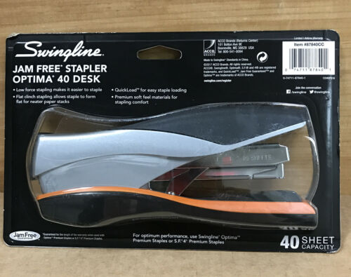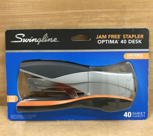 Swingline Stapler, Optima 40, Desktop, Low Force, 40 Sheets, Black/Silver--NEW. With a black-and-silver plastic housing to protect the metal stapling mechanism, the Optima 40 desktop stapler is built to give you long-lasting, reliable stapling. This stapler holds a full strip of 210 staples. Desktop design fits perfectly on medium to large desks. A helpful low-staple indicator lets you know when it's time for a refill. Optima fastens up to 40 sheets of paper, which is nearly twice the sheet capacity of standard staplers. Works best with Swingline Optima Premium or S.F. 3 Premium staples, with standard ¼” length legs. The Optima 40 design requires less force than traditional staplers, so you can save your muscle for something that matters. Soft, ergonomic grip ensures comfortable stapling. Quiet stapler is designed to be less disruptive in offices and classrooms.