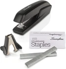 Swingline Stapler Value Pack, 20 Sheet Pack (5,000 Staples), Black Product Details Manufacturer: ACCO Brands Brand: Swingline Item Weight: 14.1 ounces Product Dimensions: 8.6 x 5.6 x 1.4 inches Item model number: S7054551H Is Discontinued By Manufacturer: No Color: Black Material Type: Plastic Number of Fasteners: 5000 Number of Items: 1 Size: Value Pack (5,000 Staples) Manufacturer Part Number: S7054551H Brand: Swingline Color: Black Material: Plastic Product Dimensions: 8.6"L x 1.4"W Number of Fasteners: 5000 RELIABLE PLASTIC STAPLER – Crafted with a modern look and feel, this easy-to-use stapler consistently delivers high quality stapling. Sleek, sturdy stapler helps you get the job done quickly. ACCESSORIES INCLUDED – Convenient package covers all of your stapling essentials. A box of 5,000 Swingline Standard Staples and a staple remover provide the perfect complement to your stapler. DESIGNED FOR DESKTOP – Ideal for use on a desk or any flat surface. This stapler holds a full strip of 210 staples. A helpful low-staple indicator lets you know when it's time for a refill. SECURES 20 SHEETS – This handy stapler fastens up to 20 sheets of paper and works best with standard size Swingline S.F. 4 Premium Staples. The staples have a standard 1/4" leg length. TACKING & PINNING – Tack papers to bulletin boards with ease: open the top of the stapler and you're ready to go. And it's simple to make pointed staples for temporary pinning: just reverse the anvil. RESISTS BACTERIA – With built-in antimicrobial protection, this bacteria-resistant stapler is ideal for shared work spaces. Convenient Swingline stapling value pack supplies high-quality stapling necessities. The package includes the modern, dependable stapler, along with 5,000 Swingline Standard Staples and a staple remover. Stapler holds a full strip of 210 staples and is designed for desktop use. A helpful low-staple indicator alerts you when a refill is needed. This stapler firmly secures up to 20 sheets of paper and works best with standard size S.F. 4 Premium Staples, with 1/4" length legs. Versatile stapler is easy to modify for tacking paper to a bulletin board or other vertical surface — simply open the top and you're ready to tack. It's also easy to produce pointed staples for temporary pinning: just reverse the anvil by pushing and rotating the knob at the bottom of the stapler. Swingline backs this high-quality stapler and staple remover with a limited 1-year warranty.