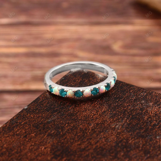 PRODUCT DESCRIPTION Natural Swiss Topaz Wedding Band Blue Topaz Half Eternity Ring Dainty Opal Band. *Metal : 925 Sterling Silver *Main Stone : Swiss Blue Topaz *Stone Color : blue *Stone Shape : Round *Size : 2 mm *Stone Creation : Natural *Second Stone : Opal Size : 2 mm Shape : Round Color : White *Personalization : Possible *Occasion : Wedding, Engagement, Birthday, Anniversary Jewelry Type: Ring Metal: 925 Sterling Silver Finished With Rhodium Method: Cast Personalization: Possible Occasion: Engagement Style: Wedding Ring Ring Size: We make rings from US 4 to US 16. (If you need smaller or bigger ring size, please ask me to resize) Country of Manufacture: India PAYMENT METHODS We accept Payoneer and the rest other modes of payment are also accepted. It is easy and safe for you to pay by credit cards, debit cards, bank transfers, and Payoneer account balances. Payment should be made within 2 days after the winning of the item. SHIPPING POLICY US shipping - Free Shipping International-Free Shipping Each item is individually packed securely with quality products to help ensure safe and undamaged delivery. We ship within 1 business day after payment is received. Delivery is generally within 10-15 days worldwide after shipping. In rare cases, it makes take up to 2-3 weeks for delivery depending upon the destinations and customs regulations in your country. All packages have a duly filled customs declaration form to avoid any delay in customs. RETURN POLICY Your satisfaction is of the utmost concern to us. Should you need to return an item, you can do so within 30 days of receipt of the item for a full refund. Return shipping charges are not reimbursable. All items must be in their original condition, not worn or altered. Please contact us if you would like to initiate a return, so that we may guide you through the process. We can be reached through the "Ask a Question" link on the listings. FEEDBACK We strive for 100% Customer Satisfaction and we always leave positive feedback to our buyers. Please help us maintain our business and give us a 5-Star rating. If you still think that you still can?t leave a 5-Star across the Board, please email us or call us and we assure you that your issue will be resolved immediately. We believe in solving the issues. Positive feedback represents our service, product quality, and dedication to customer satisfaction. Our future business depends on your satisfaction or positive feedback with a "5-star rating". Thank you !!