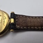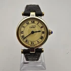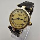 Superb & beautiful example of this Vintage Swiss Must de Cartier Vendome 925 Silver/18ct Gold Vermeil Quartz Ladies watch with Classic Cartier Gold Dial with Roman Numerals & Cabochon Cartier Crown. Comes with Original Cartier Box. Very good condition for age. Excellent aesthetic condition, no disfiguring marks or knocks. Minor wear only. Original Cartier Leather Strap is worn in places. Please see pictures Full working condition. Rare watch and a Collectors Item. Please note the watch does not come with the original papers. Watch & Box Only. Description below: [Brand] Cartier [Model] Must de Cartier - Vendome [Condition] Very Good for age [Movement] Original Swiss Cartier Quartz [Dial] Original Classic Cartier Gold Dial with Roman Numerals [Band Length Inner] 17.5 cm (approximate) [Case Size] without crown 24 mm × lug to lug 28 mm × thickness 5 mm (approximate) [Case Material] 925 Silver/18ct Gold Vermeil [Band Material] Original Cartier Leather Strap - worn in places [Crown] Original Cartier Crown with Cabochon [Accessories] Original Cartier Box Watch will be carefully shipped via registered mail with tracking, in protective shock-resistant packaging, fast and secure. Customs information: Any other costs or charges such as customs or import duties, customs clearance and handling may also apply during the shipment of your lot and will be charged to you by the involved party at a later stage if applicable.