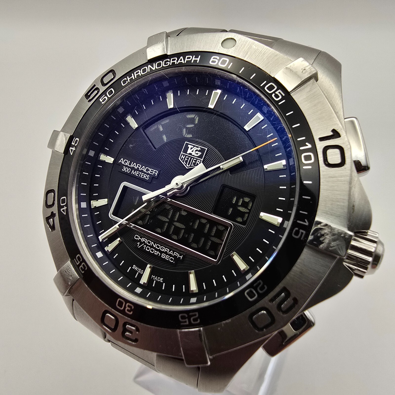 Superb & stunning example of this Swiss TAG Heuer Aquaracer CAF1010 Chronograph Stainless Steel Quartz Men's Watch with Sapphire Crystal, Rotating Bezel, Date Indicator & Analogue/Digital Displays . Very good condition. Please see pictures. Excellent aesthetic condition, minor wear only. Please see pictures. Full working condition. Comes with Watch Authentication Card. Rare watch and a Collectors Item. Please note the watch does not come with original box & papers. Watch Only. Description below: [Brand] TAG Heuer [Model] Aquaracer CAF1010 [Condition] Very good [Movement] Original Swiss TAG Heuer Quartz [Dial] Original Black Dial [Crystal] Sapphire [Band Length Inner] fit 19 cm wrist (approximate) [Case Size] without crown 44 mm × lug to lug 48 mm × thickness 14 mm (approximate) [Case Material] Stainless Steel [Band Material] Original TAG Heuer Stainless Steel Bracelet [Crown] Original Crown [Function] Chronograph, Date, Analogue/Digital Displays [Accessories] Watch Authentication Card Watch will be carefully shipped via registered mail with tracking, in protective shock-resistant packaging, fast and secure. Customs information: Any other costs or charges such as customs or import duties, customs clearance and handling may also apply during the shipment of your lot and will be charged to you by the involved party at a later stage if applicable.