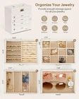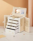 Jewelry and Watch Box: With 4 removable pillows in the top layer, you can store not only your jewelry but also your watches. ELEGANT: Attractive appearance with black faux leather surface and soft velvet lining. Over Dimension: 10.43’’ (L) X 6.10’’ (W) X 11.14’’ (H), large enough to hold your watches, necklaces, earrings, bracelets, hairpins, brooches and other jewelry. 4 Pull Out Drawers, includes a deeper bottom drawer and 3 equal size drawers. Drawer 1 has 4 earring cards and a ring roll. Drawer 2 has 12 equal size compartments. Drawer 3 has 4 equal size compartments. The deeper bottom drawer has only one compartment to store large jewelries. Each drawer is equipped with a delicate handle which can be opened easily. Swing Out Cabinets, each with 8 necklace hooks and 2 storage ledges, help to keep your necklaces from getting tangled. Perfect gift: The lid has a ribbon attached to keep it from falling back, mirror makes it easier to dress yourself, lock with a key adds elegance and security. Ideal gift for Valentine's Day, Mother’s Day, Thanksgiving Day, Christmas, birthday and wedding. Watch and Jewelry are not included.