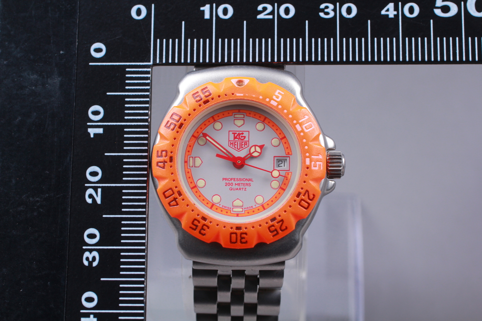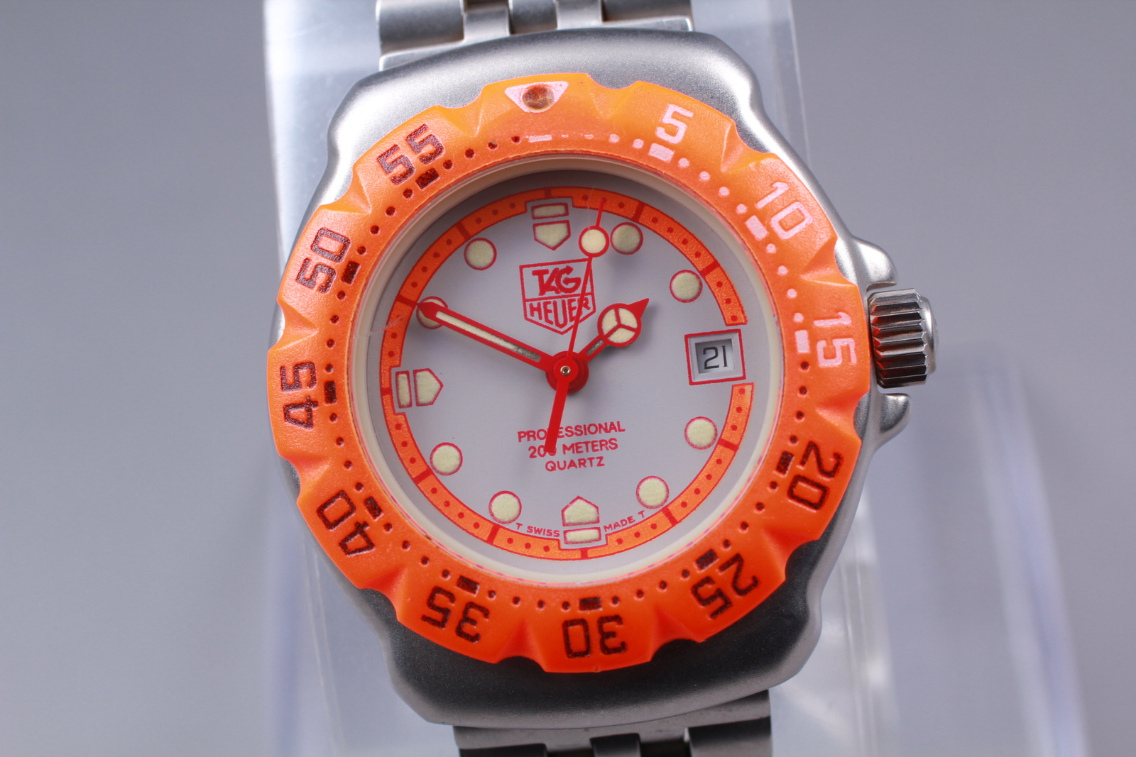 Model: TAG HEUER Formula 1 Watch Shape: Round Dial Color: White Water Resistance: 200 m (20 ATM) Reference Number: 373.508 Movement: Quartz Style: Casual Indices: Arrow Markers Year Manufactured: 1990-1999 With Papers: No Type: Wristwatch Number of Jewels: N/A Band Material: Rubber Case Material: Stainless Steel Country/Region of Manufacture: Switzerland Bezel Type: 12-Hour Brand: Tah heuler Band/Strap: Bracelet Case Color: Silver Case Size: 30 mm Bezel Color: Orange Customized: No With Original Box/Packaging: No Display: Analog Department: Women Band Color: Orange Features: 12-Hour Dial