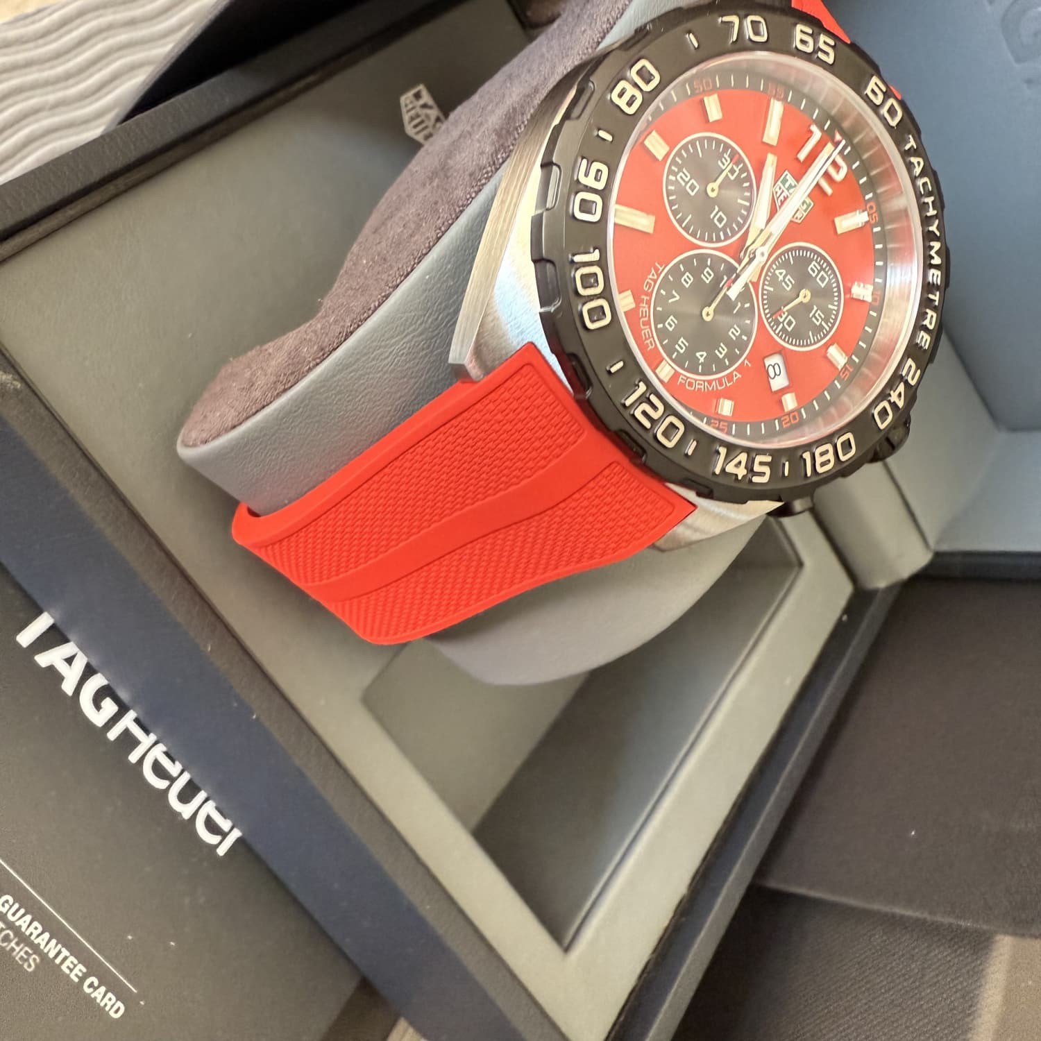 US and UK IMPORT DUTIES WILL BE PAID BY US TAG HEUER FORMULA 1 Quartz CHRONOGRAPH RED Men's Watch CAZ101AN RUBBER IN BOX 100% authentic Comes with warranty card, tag, and manual box. Official warranty has expired. This is a quartz watch All links are included. BRAND TAG Heuer SERIES FORMULA 1 GENDER M Dial DIAL TYPE - DIAL COLOR Red FINISH Luminiscence INDEXES Index HANDS Skeleton Case MATERIAL Stainless Steel BEZEL FIXED GLASS - BACK Solid SHAPE Round