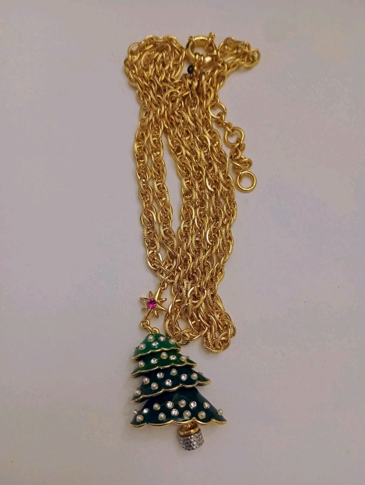 The TALBOTS Christmas Tree Pendant Necklace is a festive and stylish accessory perfect for the holiday season. Featuring a green enamel christmas tree pendant with a spring ring closure, this signed necklace is a delightful addition to any winter outfit. The pendant style and holiday theme make it a charming choice for Christmas celebrations, while the 32-inch necklace length ensures a comfortable fit. With a touch of crystal accents, this Talbots piece adds a touch of sparkle to your holiday attire. I174/3