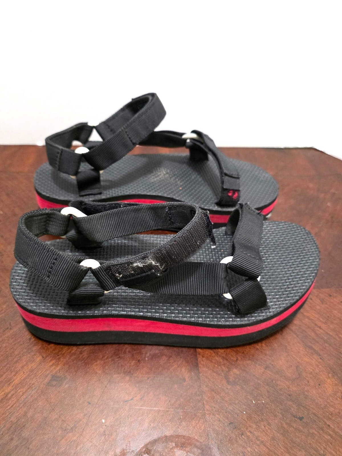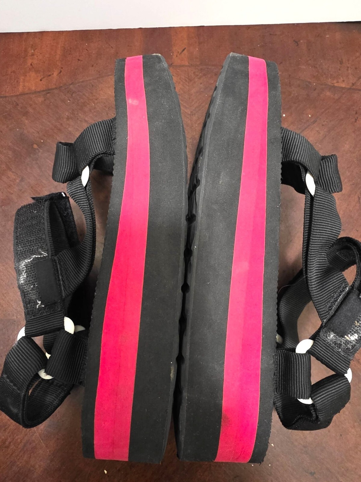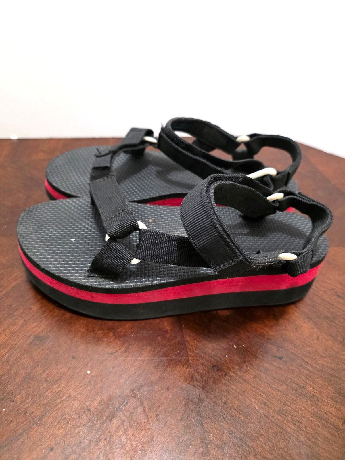 These Teva platform sandals feature a modern elevated sole with a distinctive pink stripe accent. The adjustable webbing straps and cushioned footbed provide customizable comfort and support. • Adjustable hook-and-loop straps • Textured rubber platform sole • Geometric tread pattern • Cushioned EVA footbed • Water-resistant materials • 1.5" platform height CONDITIONS pre owned, Minor wear and small glue on the side back, good conditions. see photos for flaws details.
