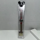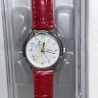 This is a Tinkerbell Walt Disney Time Works watch with a red band, still in its original factory case. The watch is made of imitation leather and was manufactured in Japan. It is a part of the Disney franchise and features the Tinkerbell character. The watch has not been modified and is in excellent condition. Perfect for collectors of contemporary Disneyana and timepieces.