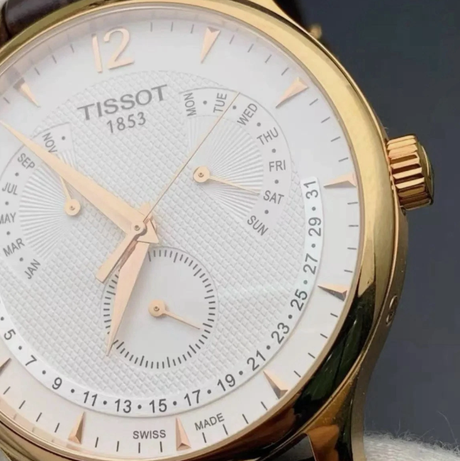 TISSOT TRADITION PERPETUAL CALENDAR T063.637.36.037.00 Diameter:42 mm 316L stainless steel case with rose gold PVD coating Swiss Quartz movement Domed scratch-resistant sapphire crystal Original box and papers