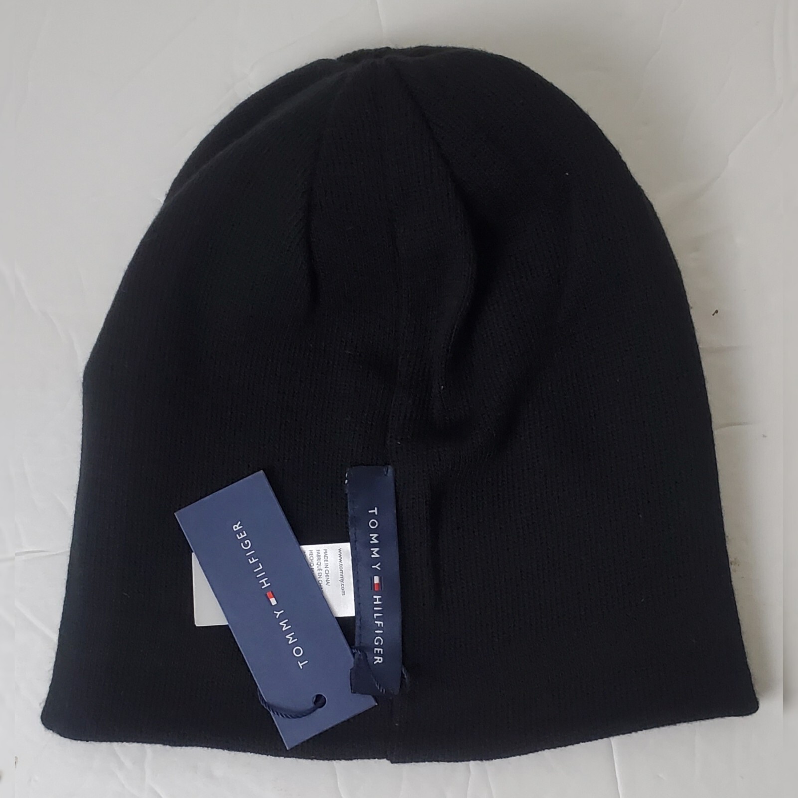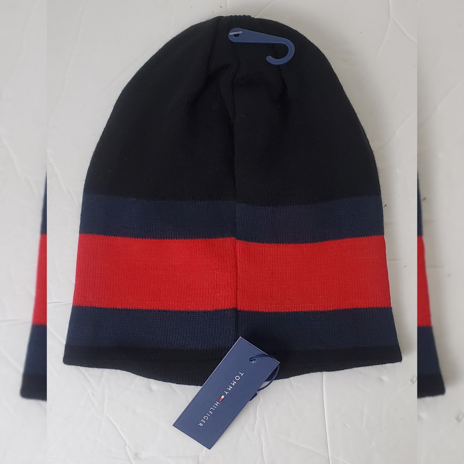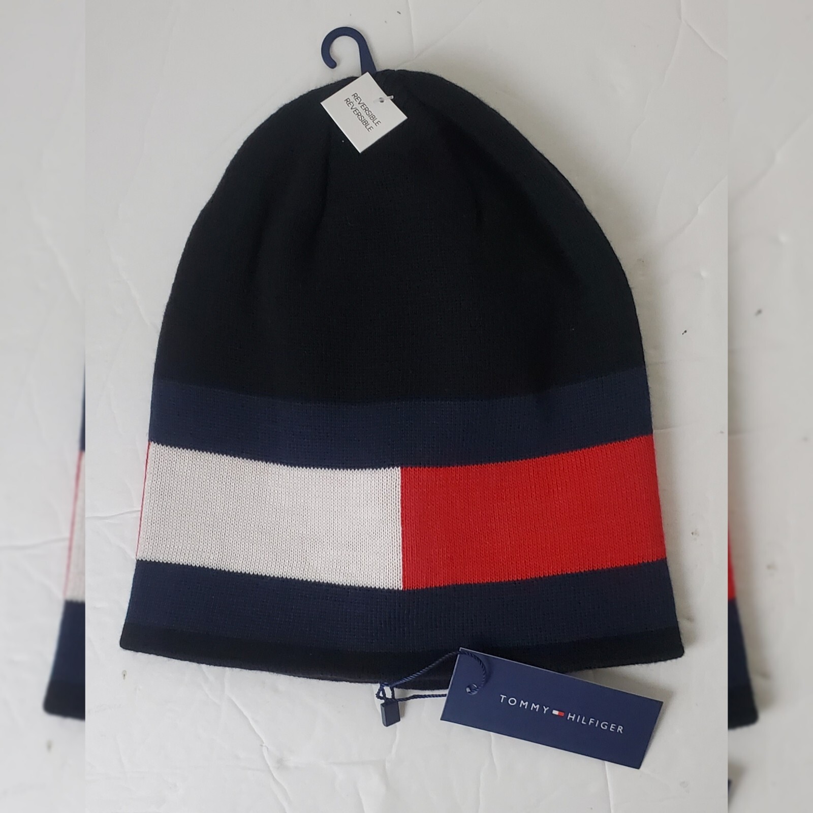 TOMMY HILFIGER AUTHENTIC REVERSIBLE BEANIE HAT MEN'S FLAG LOGO ONESIZE BLACK COLD WEATHER. CONDITION IS NEW WITH TAGS.