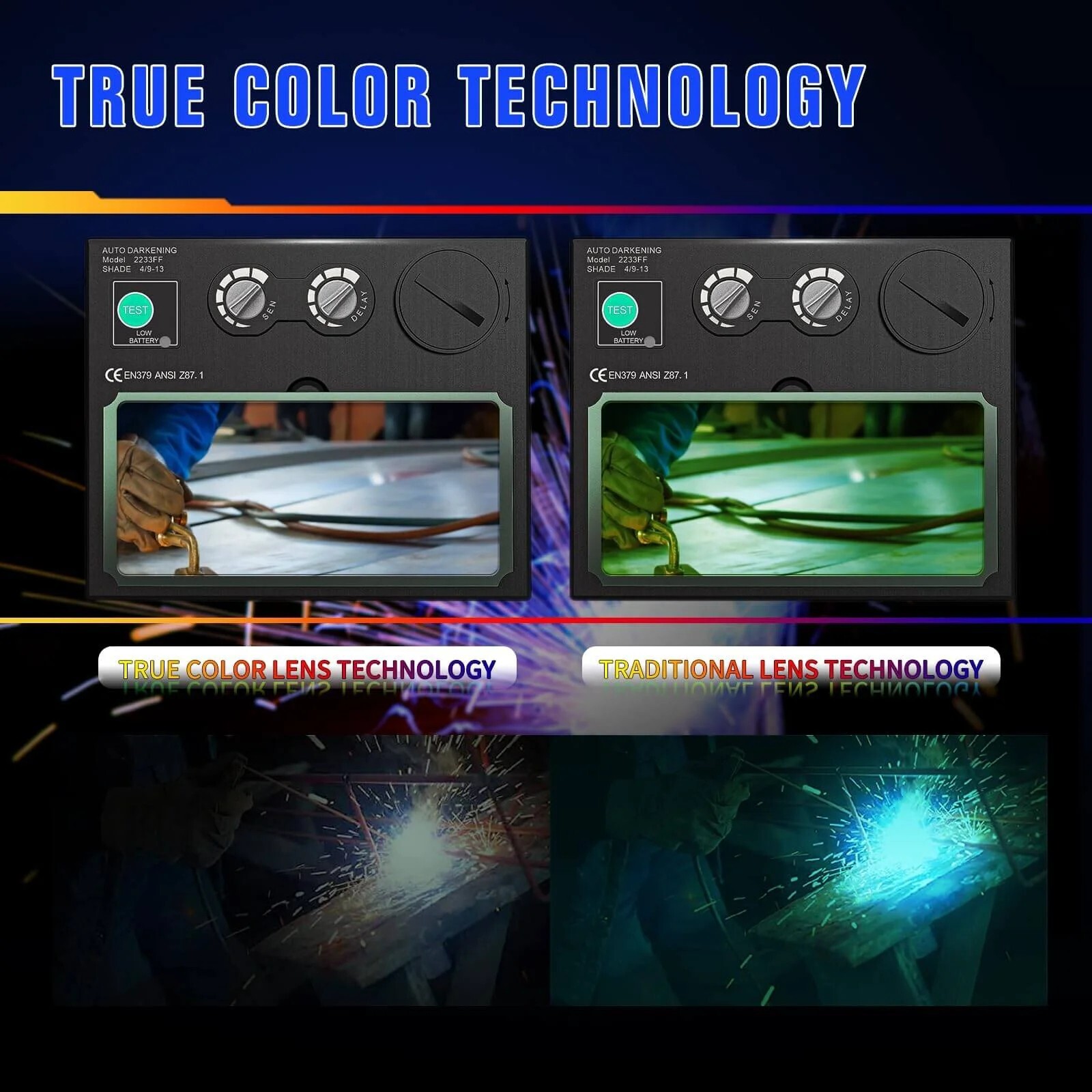 This welding helmet is a game-changer! The true color view makes welding so much clearer, and the auto-darkening feature works flawlessly. The built-in LED light is super handy for dark spaces, and the camo caps add a cool touch. Super comfortable, great visibility, and the solar power keeps it running. Definitely worth every penny—highly recommend for any welder!