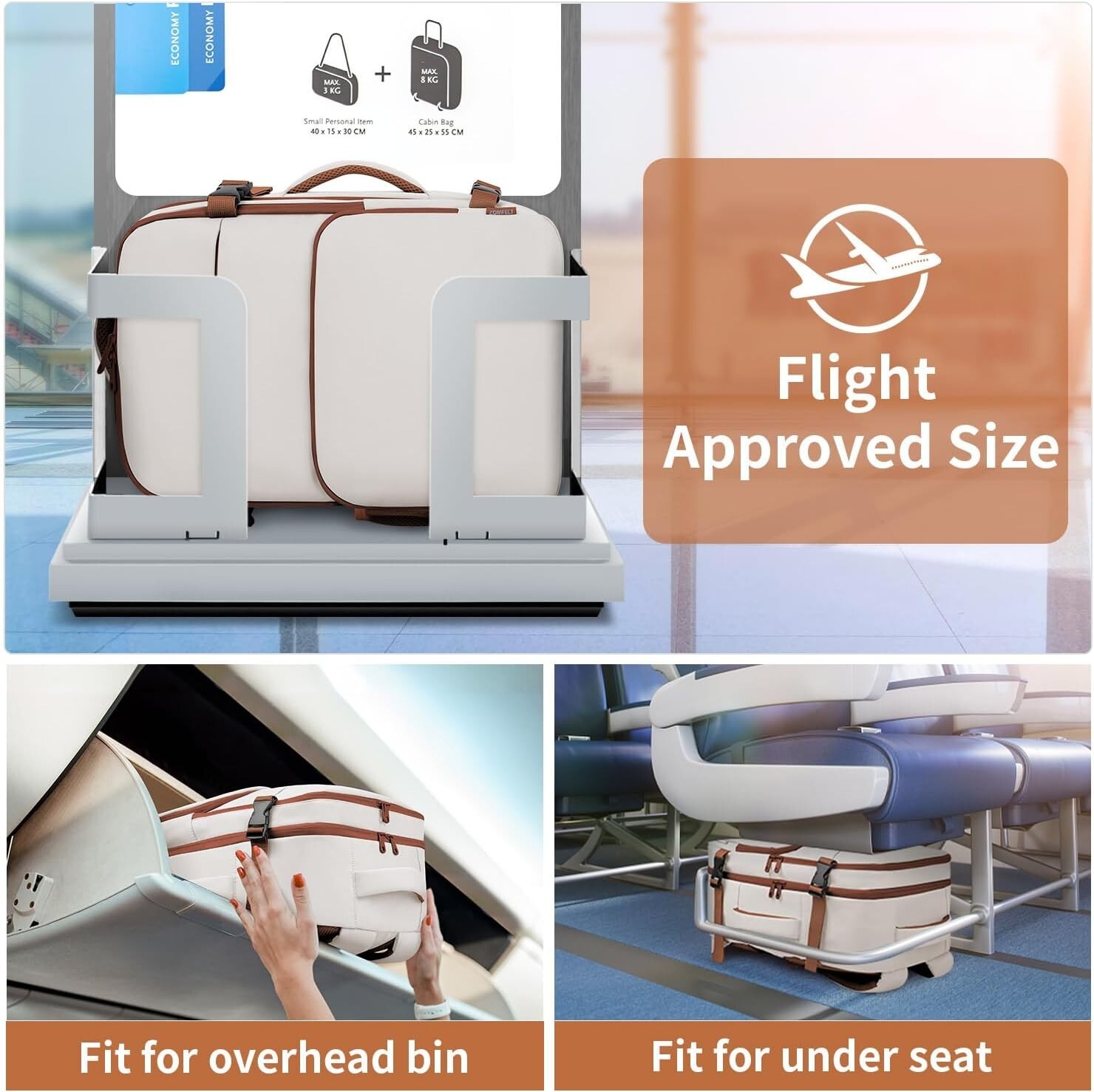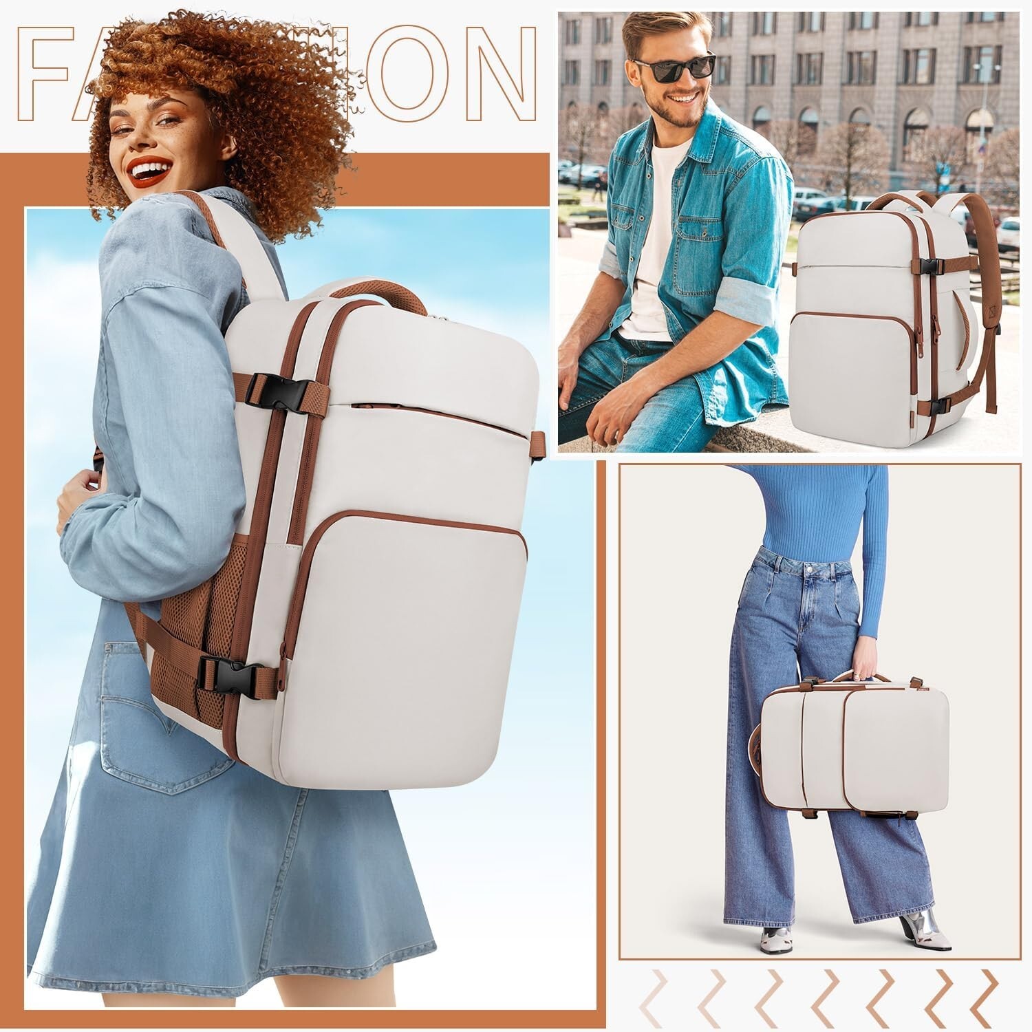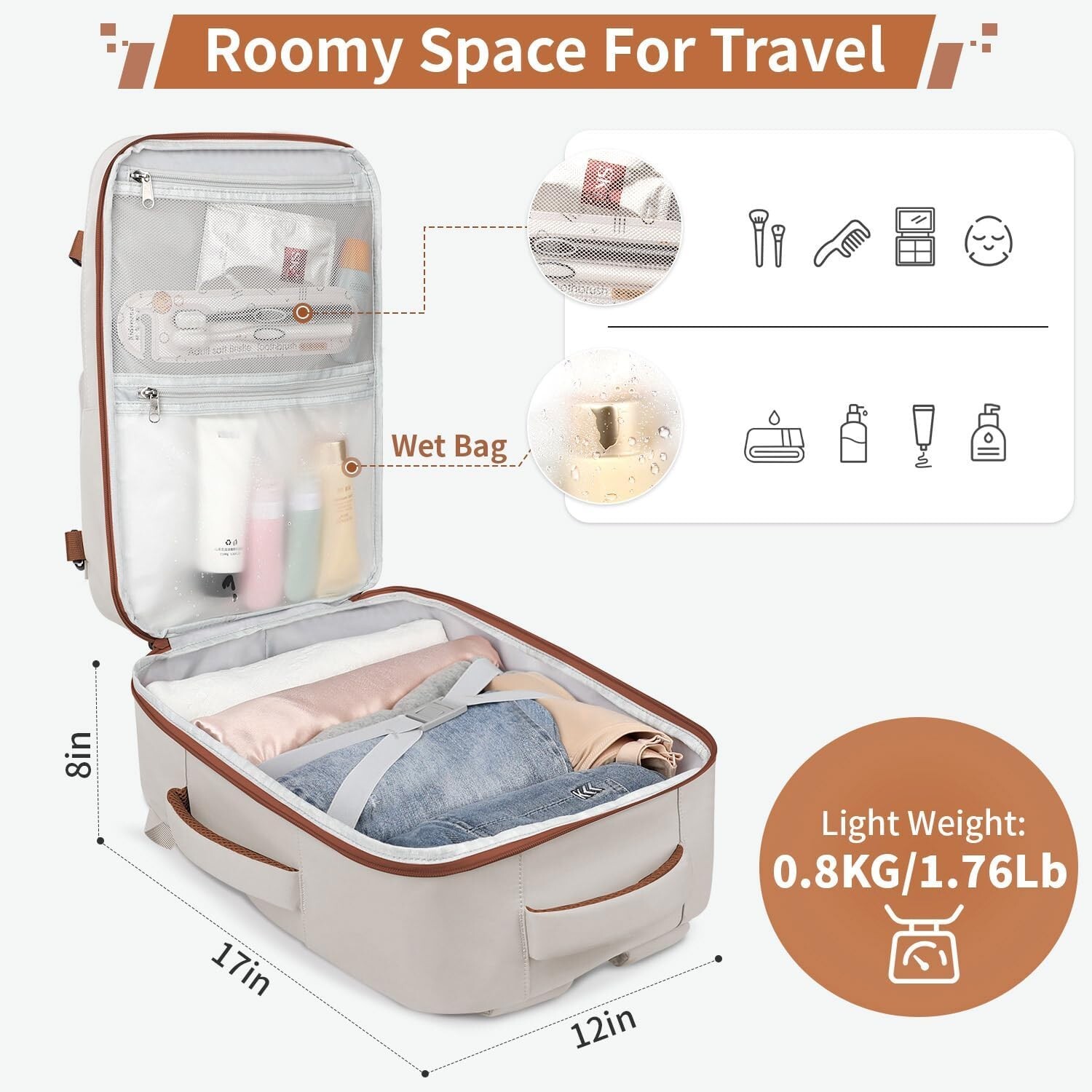 Travel Backpack for Women Men, Carry On Backpack, TSA 15.6inch Laptop Backpack Flight Approved, Personal Item Travel Bag Nurse Bag Casual Daypack for School Weekender Business, Khaki White Flight Approved Carry on Backpack: The TSA backpack for travel school measures 17*12*8 inches and weighs 0.8 kg(1.76 lbs). This travel backpack for women men traveling features a 180 degree zipper closure to help you pass through security check quickly, compliant with airline carry-on requirements. Can be a personal item travel bag fits overhead bin or under the seat and save on paying any extra baggage fees Large Capacity & Multiple Pockets: The travel backpack designed with multi functional pocket for 3-5 days travel necessities, holds about 27 L. It has main pocket, wet clothes pocket, interior pocket, side pockets, laptop compartment, organized pocket and front pockets making your items organized and easy to find. Separate laptop compartment of college laptop bookbag holds 15.6 inch laptop and 12.9 ipad. The built-in elastic bands of main pocket keep your clothes from falling Versatile Lightweight Carry on Luggage Backpack Suitcase: This travel backpack carry on offers ultimate versatility and convenience. It features padded, adjustable shoulder straps and padded handles on the top and side, allowing easy transformation from backpack to handbag. The luggage strap design makes this laptop backpack can be setted on your roll-away luggage, offer a flexible carrying experience Wet Pocket & Breathable Shoulder Straps: The personal item traveling backpack for airplane features a fully high-density waterproof wet pocket can help you to separate wet clothes or towel after stay in a hotel or apartment more convenient. Soft and breathable shoulder straps and back foam help reduce stress on your back while traveling Multipurpose & Gender-Neutral: Whether you're a male or female traveler, someone on a business trip, this carry on backpack is suitable for all. Travel back pack has many different ways to use, can be used as an everyday backpack, backpack for school college, a professional backpack for a laptop, daily gym backpack, hiking bag, business carry-on bag, travel duffel bag, teacher Backpack. 27 L travel backpack is perfect for week trips, travel, daily use. It is also the gift for family or friend