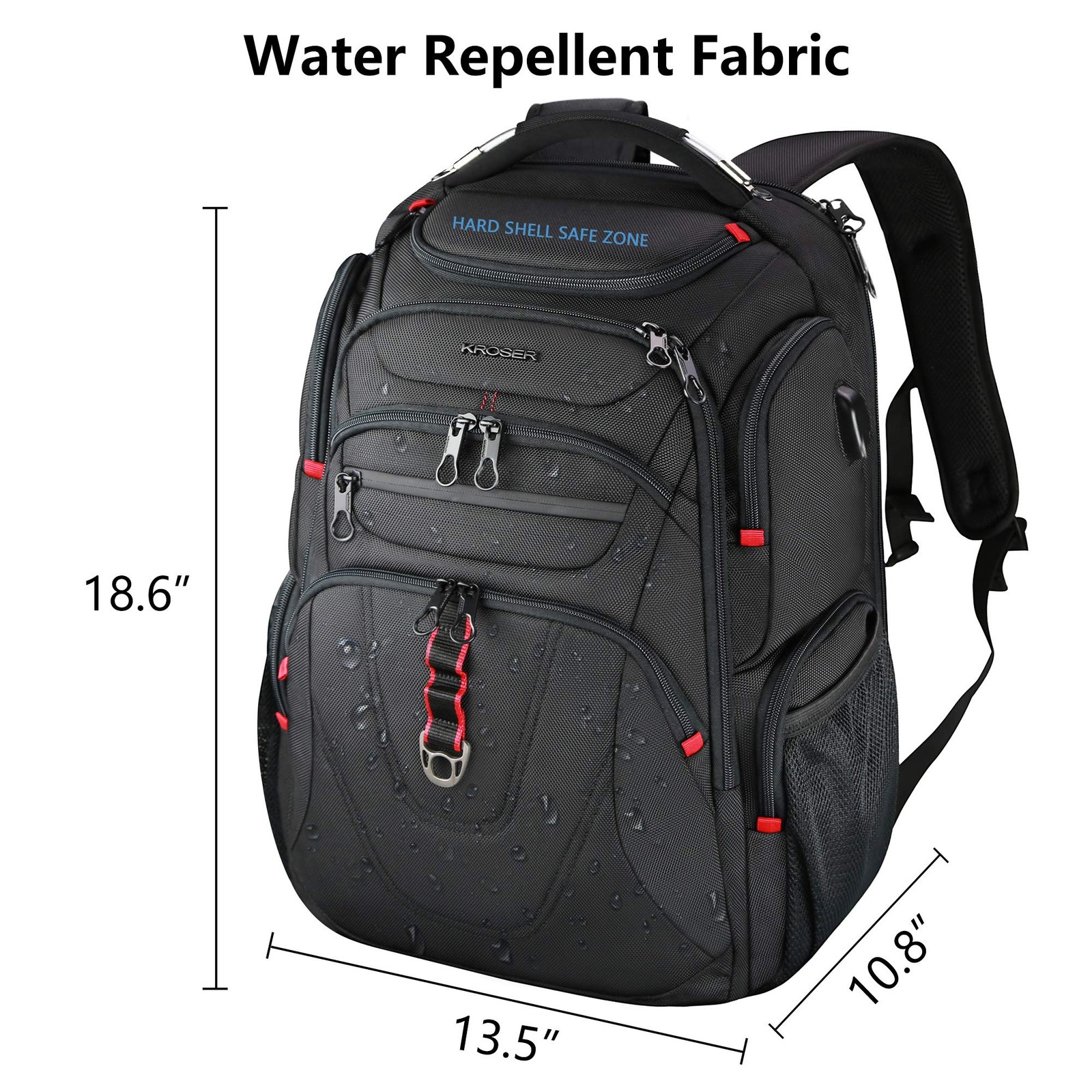 【SPECIFICATIONS】 External Dimensions: 18.6”x13.5”x10.8” Weight : 3.08LBS Material : Water-repellent ballistic fabric 【PRACTICAL FUNCTIONAL TRAVEL BACKPACK】 ★ Large Multi-Compartment and functional pockets for Professionals. ★ Anti-theft zippered pocket on the back will always keep your important items safe. ★ A luggage strap allows backpack fit on luggage/suitcase, slide over the luggage upright handle tube for easier carrying. ★ With built-in USB PORT outside, this laptop backpack is convenient to charge your cell phone by the connected power bank (POWER BANK is not included). ★ This large travel backpack can be great companion for travel, hiking, camping, holiday vacation, shopping, and any other daily occasion. 【WARRANTY AND SERVICE POLICY】 If you have any issues, suggestions, questions, or concerns. Please contact us, we will respond you within 24 hours and resolve the issue as soon as possible. 【QUALITY MATERIAL】: This stylish laptop backpack is made of durable and high-quality water-repellent ballistic fabric; Dimensions: 18.6”x13.5”x10.8”, fits up to 17.3” laptop; Weight: 3.08LBS 【MULTI-COMPARTMENT】: Our large travel backpack with separated compartments and pockets which can provide roomy space for your computer, iPad, power bank, A4 files, wallet, cards, clothes and more your items. Functional front pocket with waterproof zipper. Side zippered pockets and mesh pockets can hold your umbrella, water bottle, small accessories etc. A hard shell zone is designed on the top which is convenient and safe for you to put your sunglass, cell phone etc 【USB PORT DESIGN】: Built-in USB PORT is convenient to charge your cell phone in a safe way (POWER BANK is NOT included) FUNCTIONAL & SAFETY】:A well-knitted “ luggage strap” is quite convenient for you to fix the backpack on the trolley of your luggage, making your journey and travelling more convenient wherever you go. Design of an air-flow back padding system and a secret pocket ensures great comfort and safety in your journey. RFID Pockets with Identity protection function protects date encoded on most IDs, credit cards and passport This practical laptop backpack is large and durable, which is perfect for college, travel, business, everyday use and outdoor activities. Practical gifts for friends, mother, father, her or him