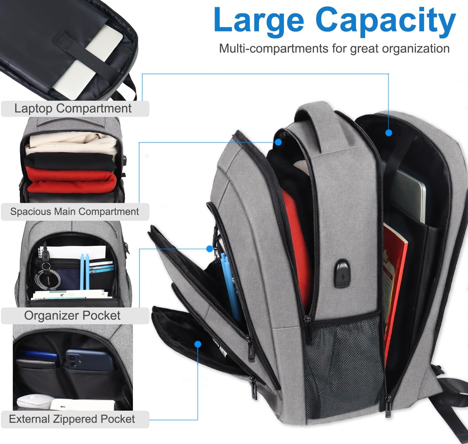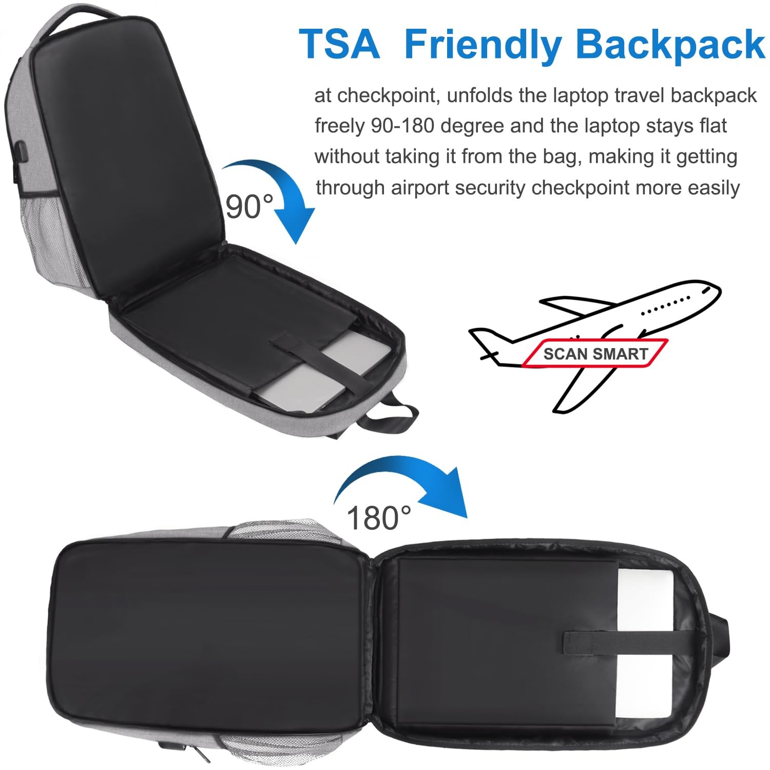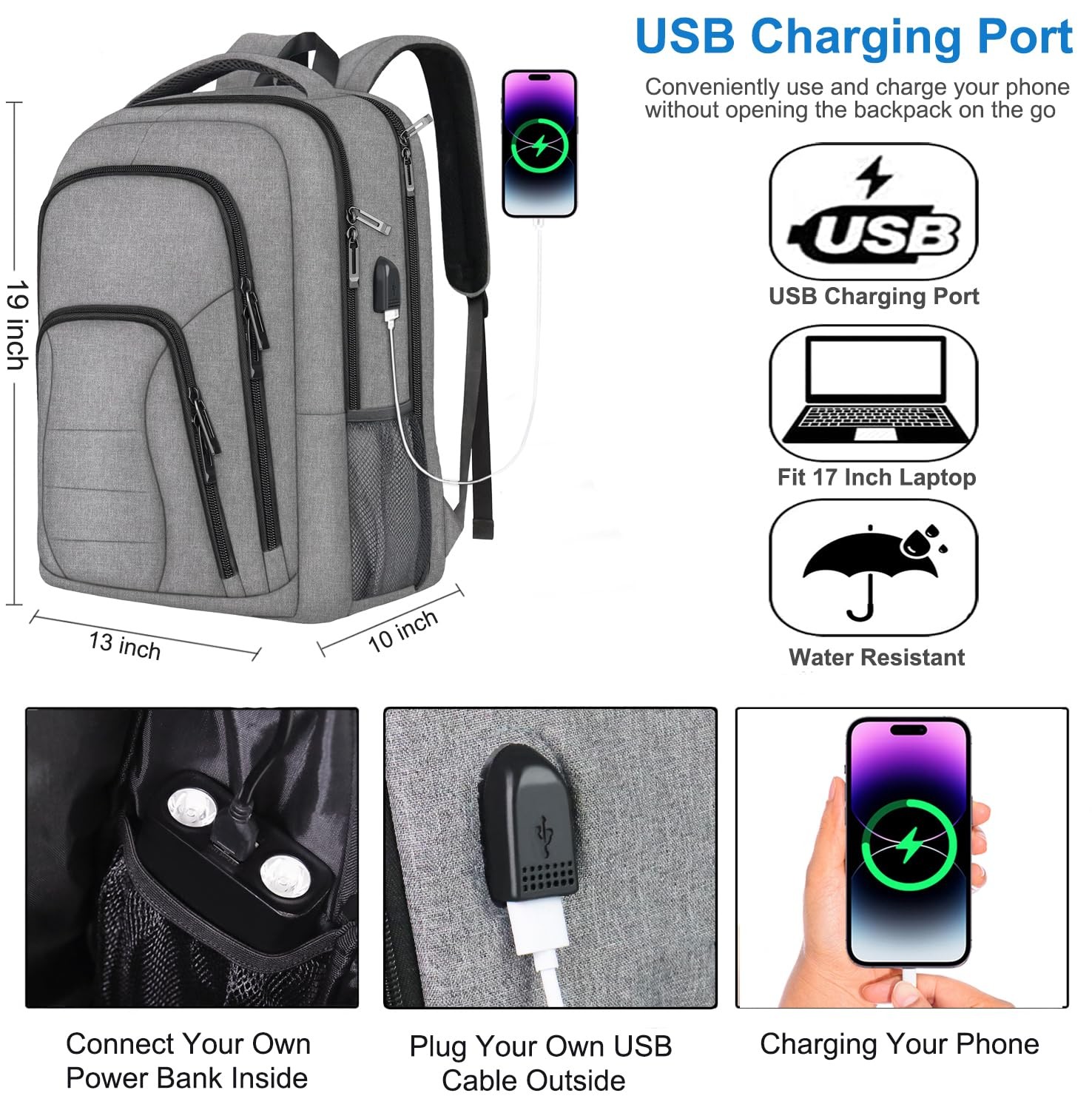 Large travel backpack has one separate laptop compartment that can hold 17.3 inch,15.6 inch laptop, 2 main double zippered compartments for clothing for weekend getaways, occasional travel and overnight stays, 1 front zipper pockets with interior small pockets to hold your wallet, passport, pens, keys, etc, 2 side pockets are deep enough for your water bottle and umbrella. make your items organized and easier to find. 【Lots Of Storage Space&Pockets】Large travel backpack has one separate laptop compartment that can hold 17.3 inch,15.6 inch laptop, 2 main double zippered compartments for clothing for weekend getaways, occasional travel and overnight stays, 1 front zipper pockets with interior small pockets to hold your wallet, passport, pens, keys, etc, 2 side pockets are deep enough for your water bottle and umbrella. make your items organized and easier to find. 【TSA Approved Travel Backpacks】TSA-Friendly function is exclusively designed for airplane flight travel. at checkpoint, unfolds the laptop travel backpack freely 90-180 degree and the laptop stays flat without taking it from the bag, making it getting through airport security checkpoint more easily. served as a large laptop bag, large business backpack .mens backpack can use as daily / work / airplane travel. THIS ITEM IS NOT INTENDED FOR USE BY CHILDREN 12 AND UNDER 【High Quality Material】This Laptop backpack is made of high-quality oxford fabric for better tear and water resistance. it provides more security and protection for your items on rainy days. metal zippers, lightweight and sturdy, ensure a secure & long-lasting usage every day. perfects for weekend getaways, shopping, office work, business traveling and other outdoor activities. THIS ITEM IS NOT INTENDED FOR USE BY CHILDREN 12 AND UNDER. 【USB Port Design】With built in usb charger outside and built in charging cable inside,this usb backpack offers you a more convenient way to charge your phone while walking.please note that the usb backpack itself does not supply power, and the usb charging port only provides easy charging. perfect for travel, picnic, hiking with your family and friends. 【Breathable & Comfortable】Padded and breathable mesh back panel of this computer backpack design help with ventilation, air convection, and heat elimination. comfortable, wide, and breathable mesh shoulder straps with plentiful sponge pads help relieve shoulder pressure. ergonomic design ensures that the travel backpack is comfortable to wear when loaded with all your gear. reinforced padded top handles for easy carrying. 【Laptop Backpack】Large travel backpack has 17.3 inch computer compartment. It will be very convenient to carry a laptop. The seperated compartment can prevent the laptops from scratching. which perfects for business traveling, professional office work bag and other outdoor activities. 【Anti-Theft&Functional】The backpack back luggage strap allows travel laptop bag fits on suitcase, slide over the luggage upright handle tube for easier carrying. a small anti-theft pocket located on the lower back keeps your phone, wallet, passport, and other valuable items safe and handy. internal shockproof belt is for fastening your laptop and ipad, preventing them from sliding and bumping. 【Travel Gifts Idea】This carry on backpack can be used as a laptop backpack, travel backpack, overnight trip backpack, or business backpack. 【17.3 Inch Backpack Dimensions】The dimension of travel backpack is 19 x 13 x 10 inch. you can carry it onto airplane. the carry on backpack ensure a secure long-lasting usage everyday or weekend, serve you well as travel personal carryon bag, business trip, outdoor activities backpack, perfect for men, women.