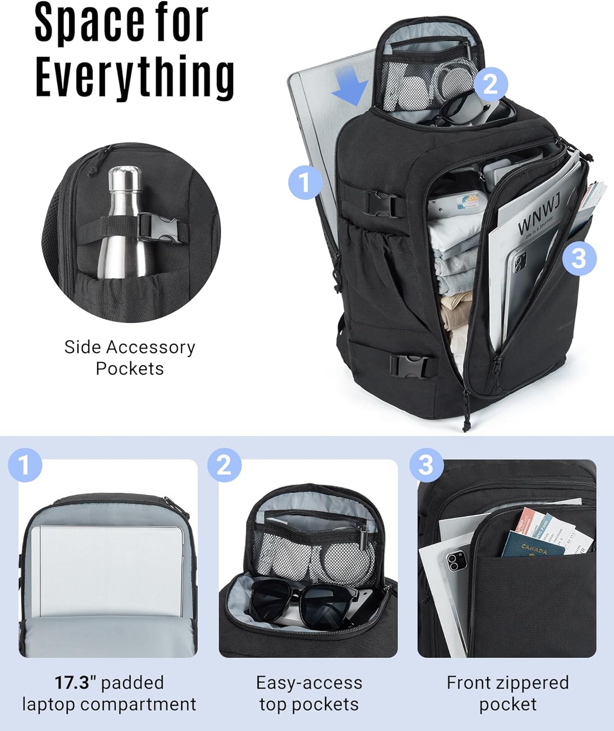 Menu Other Items Feedbacks About Us Contact Us Add To Favorites Travel Backpack, TSA Friendly Flight Approved Carry on Backpack Water-Resistant Lightweight Business Large Weekender Bag Casual Daypack 17.3" Laptop Backpack for Men Women,Beige Large Capacity: This travel backpack features 5 compartments, providing ample space for all travel essentials. With a capacity of 30L, the carry on backpack meets most airlines' personal item size requirements and functions like carry-on luggage, accommodating up to 7 days of travel. Whether you're packing for a short trip or an extended excursion, this large capacity carry-on bag allows you to bring everything you need, from clothes to tech gadgets, without unnecessary bulk. Travel-Friendly Organization: Featuring a 180° suitcase-style opening, this travel backpack for women makes packing and organization easy. The spacious main compartment holds outfits for 3-7 days or family clothing. A dedicated 17-inch laptop compartment ensures your device stays protected. The top quick-access pocket is great for sunglasses, passports, or electronics. Large vertical file pocket, and front slip pocket for quickly tossing in items. Large side pocket for a water bottle. Carry-On Flight Approved Laptop Backpack: Dimensions: 17.5" x 12" x 7.4"; Weight: 1.36 lb. Breeze through airport security with this travel backpack carry on flight approved as a personal item travel bag. Carry on backpack for airplanes fit in overhead and under the seat. The luggage pass-through allows you to slide womens travel backpack onto suitcase horizontally. The side compression straps secure overpacked items to meet airline requirements. Redefined Comfort: This backpack for women is designed with ergonomics in mind, featuring a thickly padded, breathable mesh back panel that provides exceptional comfort. The shoulder straps help reduce shoulder strain. Top and side handles offer versatile carrying options. Enhanced Durability: Made from premium, durable, water-resistant nylon, travel backpacks are built to withstand even the toughest journeys. Smooth, reliable zippers complement its rugged design, making weekender backpack a reliable companion for travel challenges. Multipurpose: Combining style with functionality, this laptop backpack is ideal as a college backpack, travel backpack, computer backpack, bookbag, or work backpack. Its airline-approved carry-on size makes it convenient for weekend getaways, business trips, and daily commutes. Its spacious and practical layout also makes it suitable as a thoughtful gift for professionals, friends, and family for occasions like birthdays, Valentine’s Day, or Christmas. Product Description 1 Large Capacity 2 Convenient 180° Opening 3 17.3" Laptop Protection 4 Quick Access Pocket 5 Front zippered pockets 1 Urban Tourism 2 College Backpack 3 Business Backpack 4 Travel Backpack Compare with similar items Add to Cart Add to Cart Add to Cart Add to Cart Add to Cart Add to Cart Customer Reviews 4.5 out of 5 stars 55 4.7 out of 5 stars 366 4.7 out of 5 stars 3,388 4.7 out of 5 stars 873 4.7 out of 5 stars 5,830 4.7 out of 5 stars 340 Price $34.99 $ 34 . 99 $29.99 $ 29 . 99 $34.99 $ 34 . 99 $34.99 $ 34 . 99 $18.49 $ 18 . 49 $27.99 $ 27 . 99 Dimensions 17.5 x 12 x 7.4 inches 16.8 x 11.7 x 5.9 inches 17.3 x 11.5 x 6 inches 17.7 x 11.8 x 9 inches 17.3 x 11.5 x 6 inches 20 x 14 x 9.5 inches Fit Laptop Sizes 17.3‘’ 15.6‘’ 15.6‘’ 15.6‘’ 15.6‘’ 17.3‘’ Padded Laptop Compartment ✔ ✔ ✔ ✔ ✔ ✔ Water-Resistant ✔ ✔ ✔ ✔ ✔ ✔ Luggage Strap ✔ ✔ ✔ ✔ ✔ ✔ Item Specification Age Range Description Adult Capacity Total 40 Liters Color 02-beige Product Dimensions 12.48 x 7.8 x 18.72 inches Item Weight 1.36 Pounds Department unisex-adult Size Large SHIPPING FREE FAST SHIPPING FREE SHIPPING We are always working hard to ensure your package arrives as soon as possible. Please understand that some factors like weather, high postal traffic, and the performance of shipping companies are outside of our control. We offer free shipping to the lower 48 states. We do not accept P.O. Boxes. Please provide a physical address. If you have a problem or question regarding your transaction please contact us immediately. We will work with you to resolve any problem you may have. Thank you