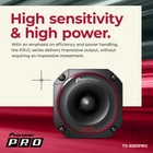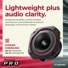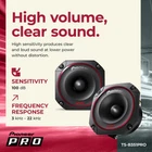 Upgrade your car's audio system with the TS-B351PRO 3-1/2” car Speakers. These speakers are designed to deliver enhanced sound quality and performance, allowing you to enjoy your favorite music like never before. The Refereor Open Show (P.R.O.) series of speakers is designed specifically for those looking to produce some serious sound pressure levels. Inspired by ’s history of record-breaking SPL competition, the new P.R.O. series line of speakers is constructed with the street enthusiast in mind. With an emphasis on efficiency and power handling, the P.R.O. series lineup consists of bullet tweeters, mid bass drivers, and a subwoofer that can be mixed and matched to deliver impressive output, without requiring a significant investment. With a maximum power handling of 300 watts and a continuous power handling of 150 watts, the TS-B351PRO can handle higher power levels, allowing you to enjoy louder and more dynamic audio. The speakers are designed to deliver impressive volume levels without sacrificing clarity or causing distortion. Experience improved sound quality, enhanced bass, and clear vocals, bringing your music to life on the road. Enjoy the quality and elevate your in-car audio experience. Titanium Diaphragm and Aluminum Die-Cast Chassis - Boasts a Titanium diaphragm for crisp and clear high-frequency reproduction, while its Aluminum Die-cast Chassis provides exceptional durability, minimizing vibrations and ensuring premium sound. Power Handling - Maximum power handling of 300 watts and a continuous power handling of 150 watts, these speakers deliver dynamic sound. Crisp highs or deep lows ensure that you can experience a wide range of frequencies with clarity and accuracy. Frequency Response – The TS-B351PRO delivers a seamless response spanning from 3.0 kHz to 22 kHz. Prepare to indulge in a truly immersive audio journey as you explore the depths of your favorite tunes with unparalleled clarity and richness. Sensitivity - With a sensitivity rating of 100dB, these speakers guarantee the production of clear and powerful sound, even when driven by lower power inputs. Enjoy your music without any distortion, even when you crank up the volume to higher levels. P.R.O. Series Speakers - The Reference for Open Show series is built for producing serious sound pressure levels. Its cutting-edge design ensures unmatched durability and performance, delivering powerful audio for years to come.