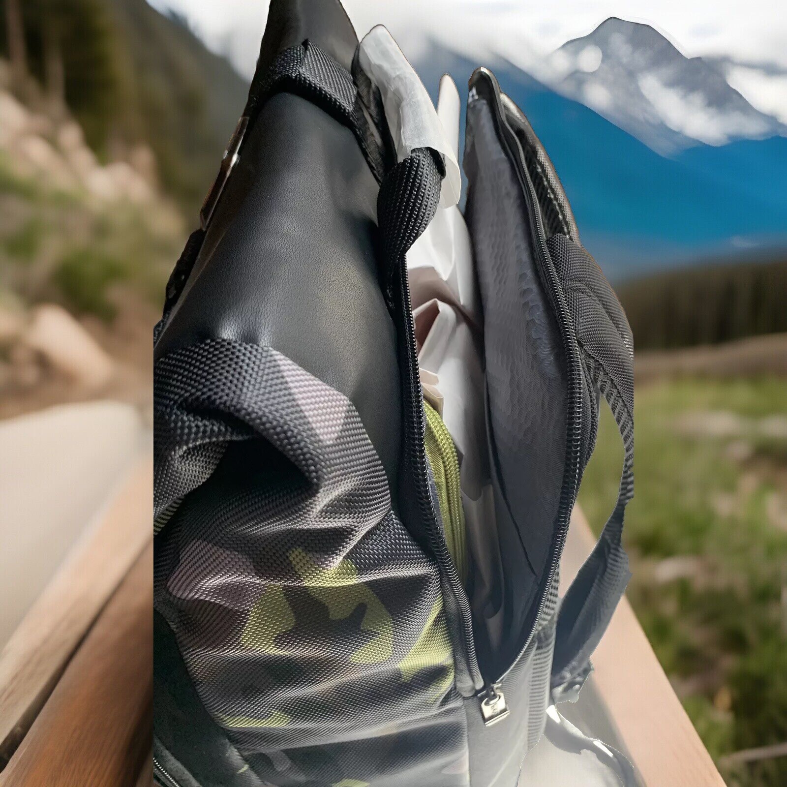 The NEW-TUMI Alpha Bravo London Roll Top Backpack in Gray Green Camouflage is a stylish and functional accessory for men. Made from durable Ballistic Nylon and Leather materials, this large-sized backpack features a zip closure and adjustable straps for added comfort. Perfect for various occasions including travel, casual outings, formal events, workwear, and business meetings, this backpack showcases the iconic London theme with its camouflage pattern. The nylon lining ensures both durability and style, making it a practical choice for everyday use.